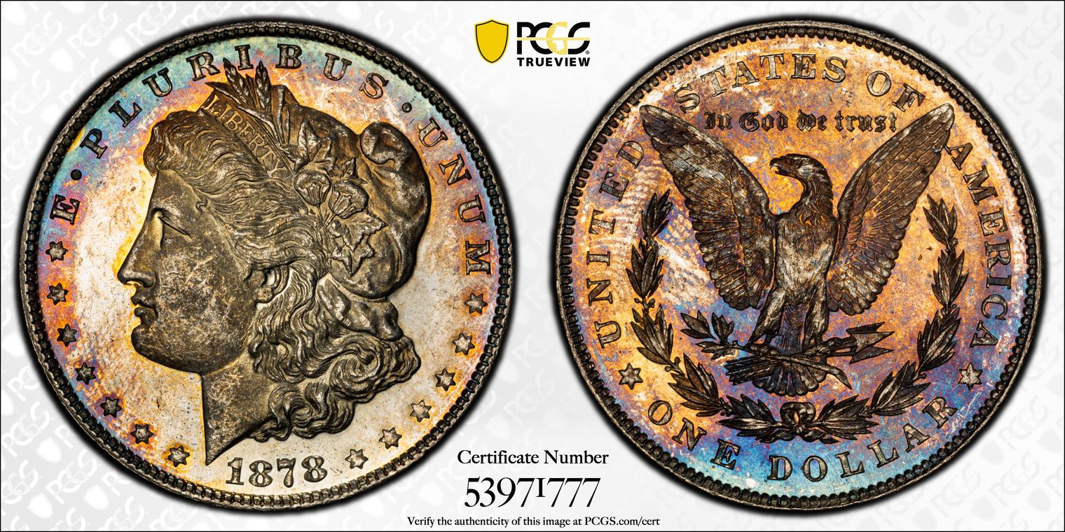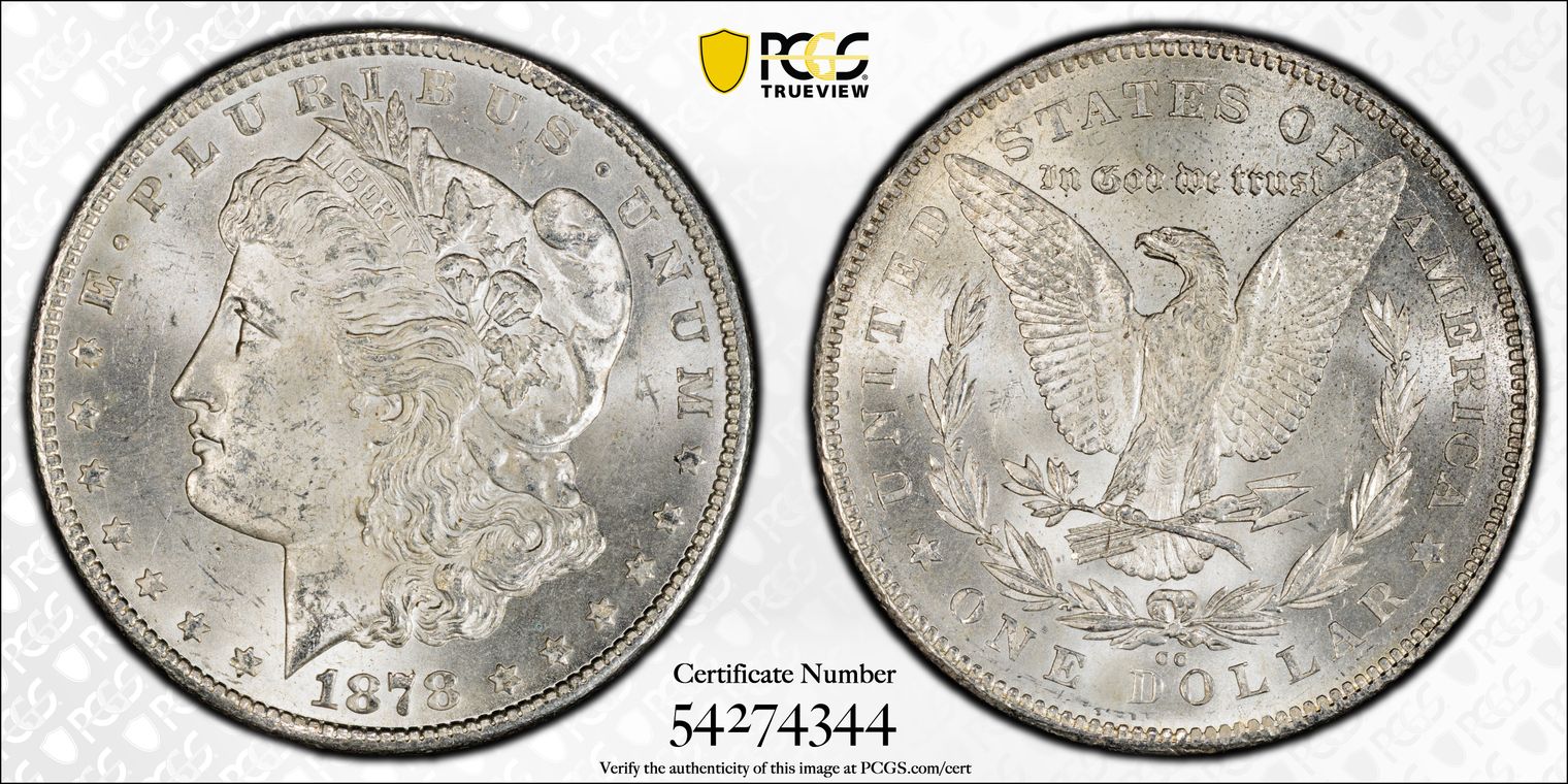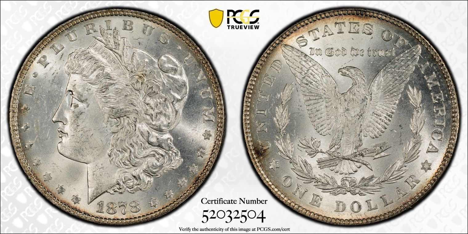 CACG Certification 7448.64/70023207 | Attractive original peripheral toning in warm golden russet hues that frame brilliant silvery centers, with strong cartwheel luster and excellent eye appeal. Obverse shows sharp details on Liberty's hair, cap, and cotton bolls, with minimal marks for the grade and a bold "1878" date. Reverse features a well-struck heraldic eagle, crisp legends, and the clear "S" mint mark, enhanced by matching rim toning.