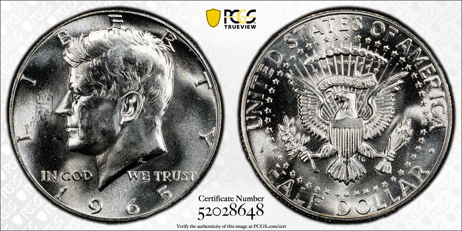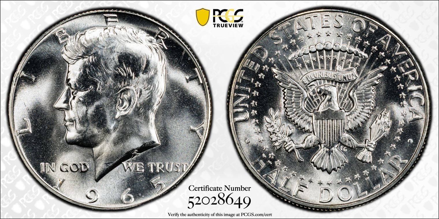 CACG Certification 7600.65/860528056 | Green Witter Brick | Strike: Well-executed and nicely detailed for the issue; Liberty's hairlines and cap exhibit good separation with crisp definition, stars are sharp, and the eagle's breast feathers show better-than-average separation without the softness sometimes seen on this common P-mint date. A balanced, pleasing impression overall | Surface Quality: Exceptionally clean for MS65; fields are smooth with only the lightest, scattered ticks and micro-abrasions that vanish under normal viewing angles with no heavy bag marks, hairlines, or distractions mar the premium eye appeal | Luster: Radiant satiny-to-frosty cartwheel glow, with strong, rolling luster bounces brilliantly across both sides with that classic mint frost skin, giving the coin a fresh, original look | Toning: Delicate, even golden-silver patina blankets the surfaces with soft peripheral accents of warm honey and faint champagne hues, adding subtle originality and warmth without overpowering the brilliant underlying luster. A restrained, natural tone that enhances rather than dominates.