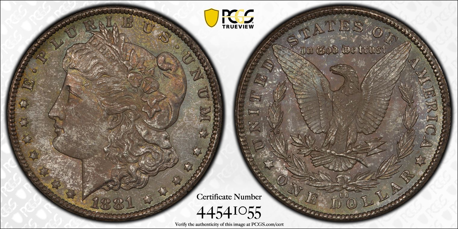 CACG Certification 7485.62/836630643 | Boasts proof like surfaces with deep mirrored fields and frosty devices, accented by subtle golden toning at the rims for captivating contrast and eye appeal. Obverse features a sharply struck Liberty with flowing hair details, bold cap folds, and clear 1881 date; reverse displays a majestic eagle with crisp feathers, arrows, olive branch, and prominent "O" mintmark.