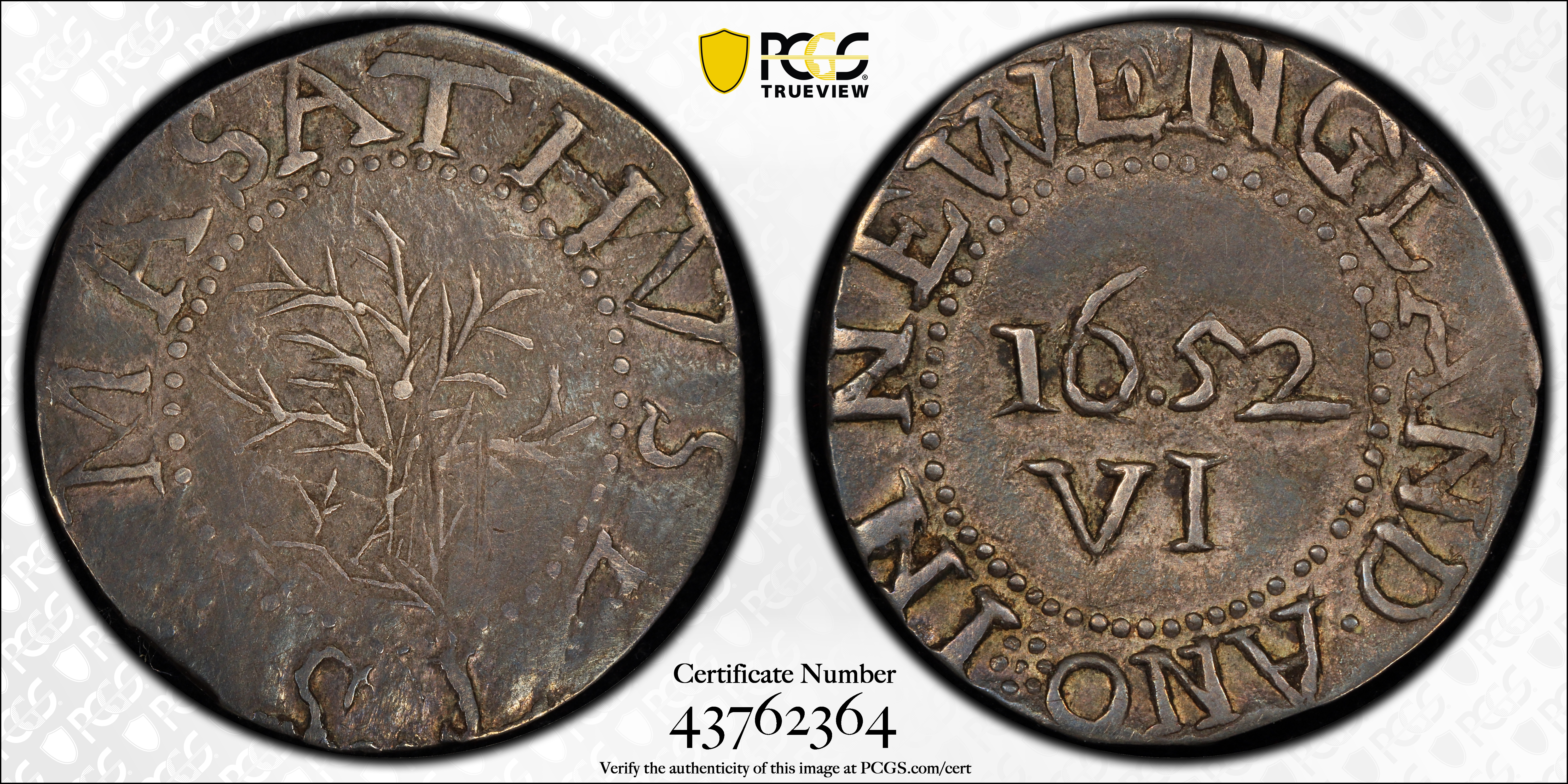 1652 6P Oak Tree, 'IN' on Reverse AU55 Certification #43762364, PCGS #45359