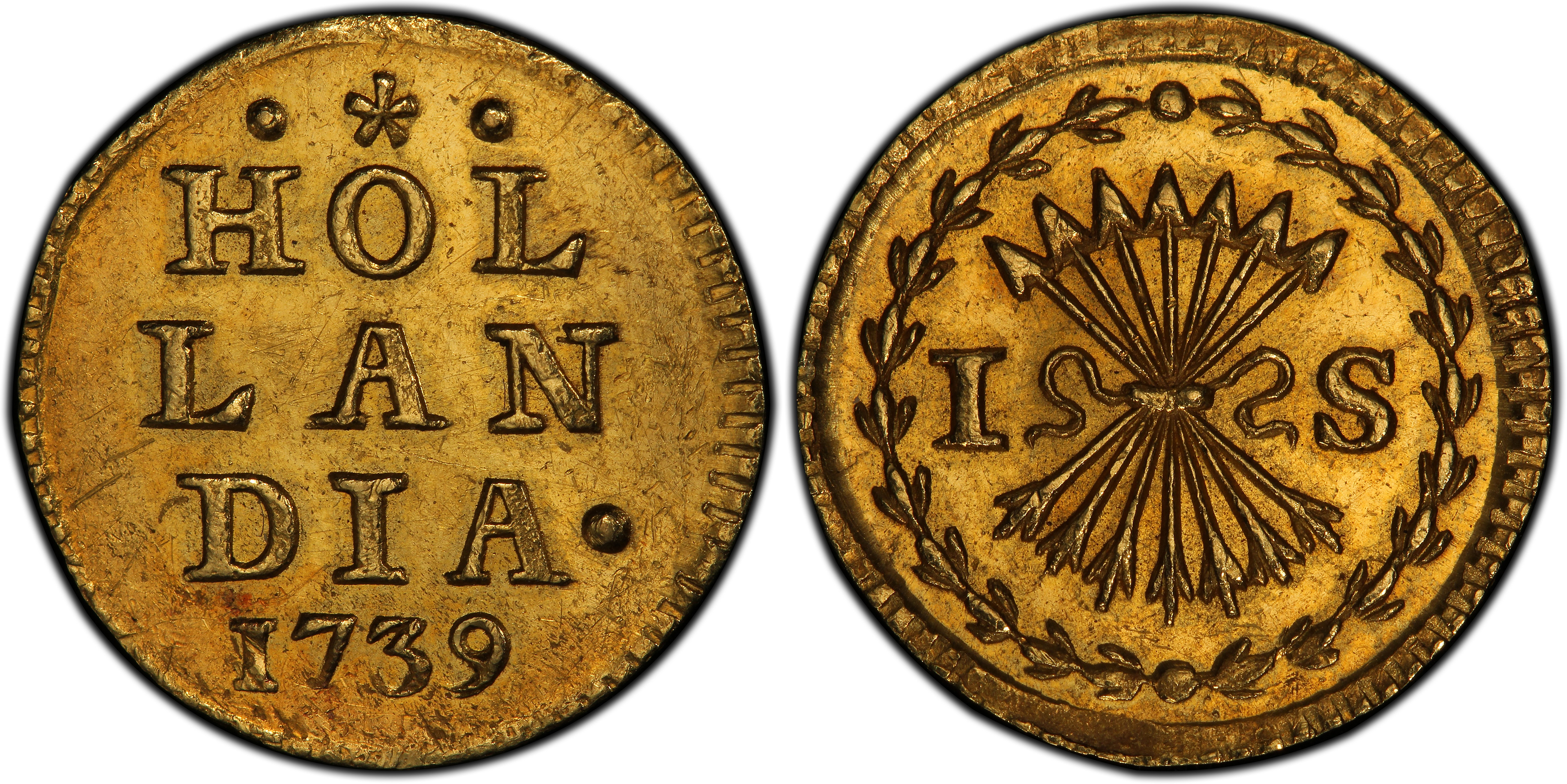 Netherlands: Holland. Gold Stuiver, 1739 PCGS MS62. KM-91a. Arrows and value. Reverse; City and date. PCGS graded MS-62. Ex: Goldberg, June 2016, Lot 2406.