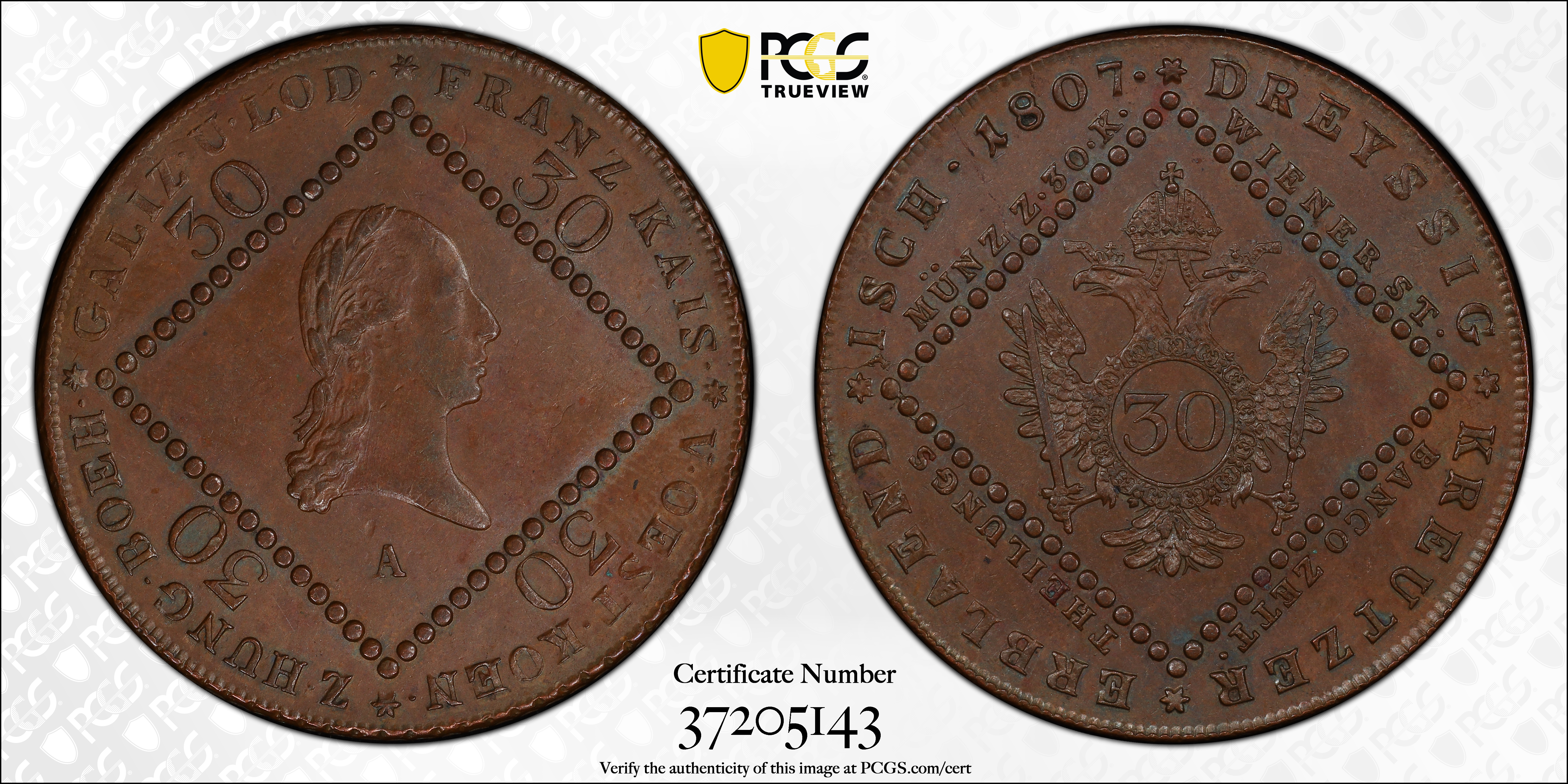 1807-A 30 Kr, BN AU58BN Certification #37205143, PCGS #19380