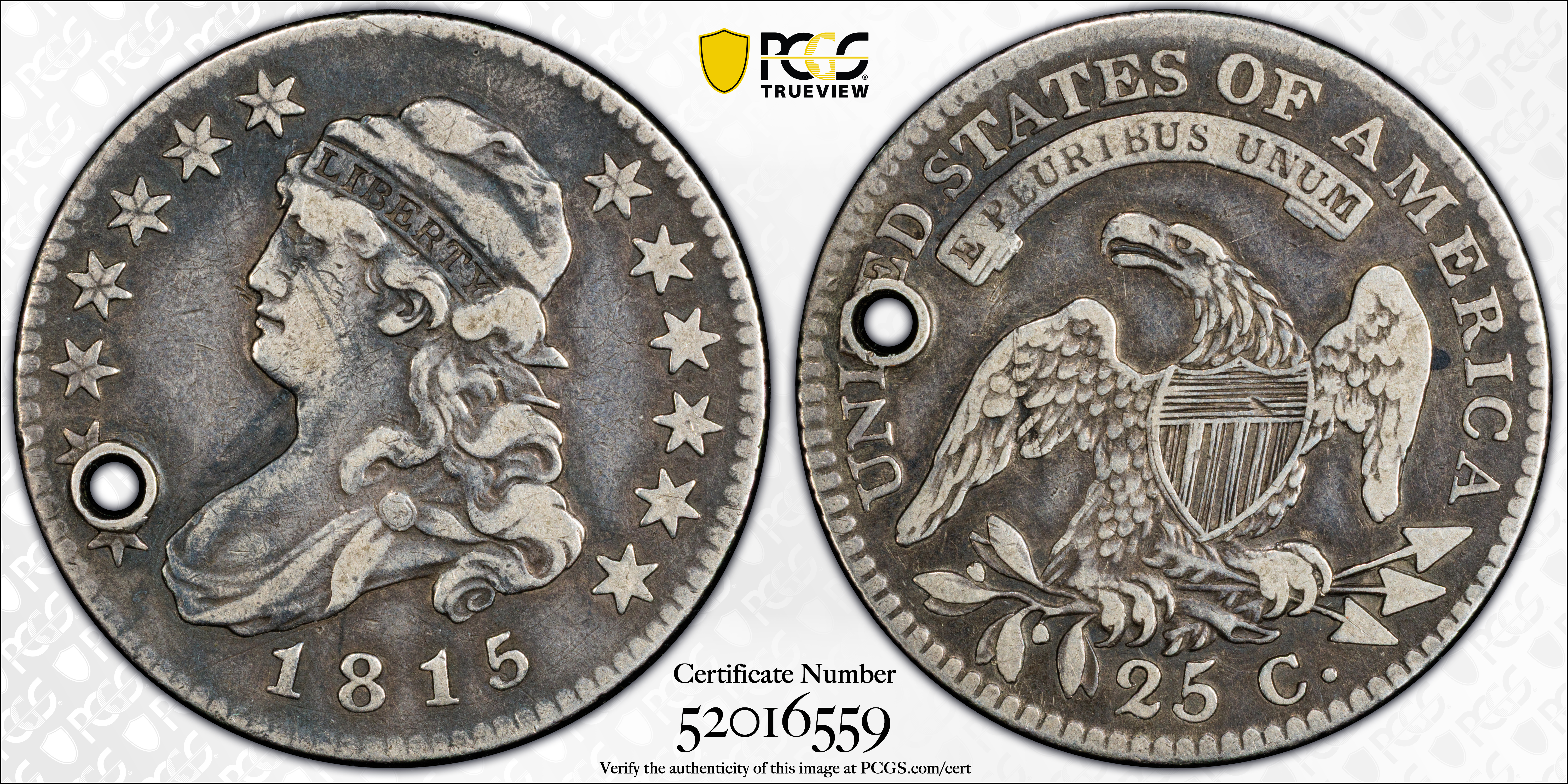 1815 is the first year for the Capped Bust Quarter type, and all known survivors are struck from a single die pair. In his “Early United States Quarters 1796-1838”, Steve Tompkins includes correspondence between Bailly Blanchard, head cashier of the Planters Bank of New Orleans, and Mint Director Robert L. Patterson, where Blanchard pleaded with Patterson to return only quarter dollars in exchange for the bank’s deposit of silver. After much hesitation, as no quarter dollar dies were available, Patterson gave in to Blanchard’s request, and production of the quarter dollar denomination was resumed.