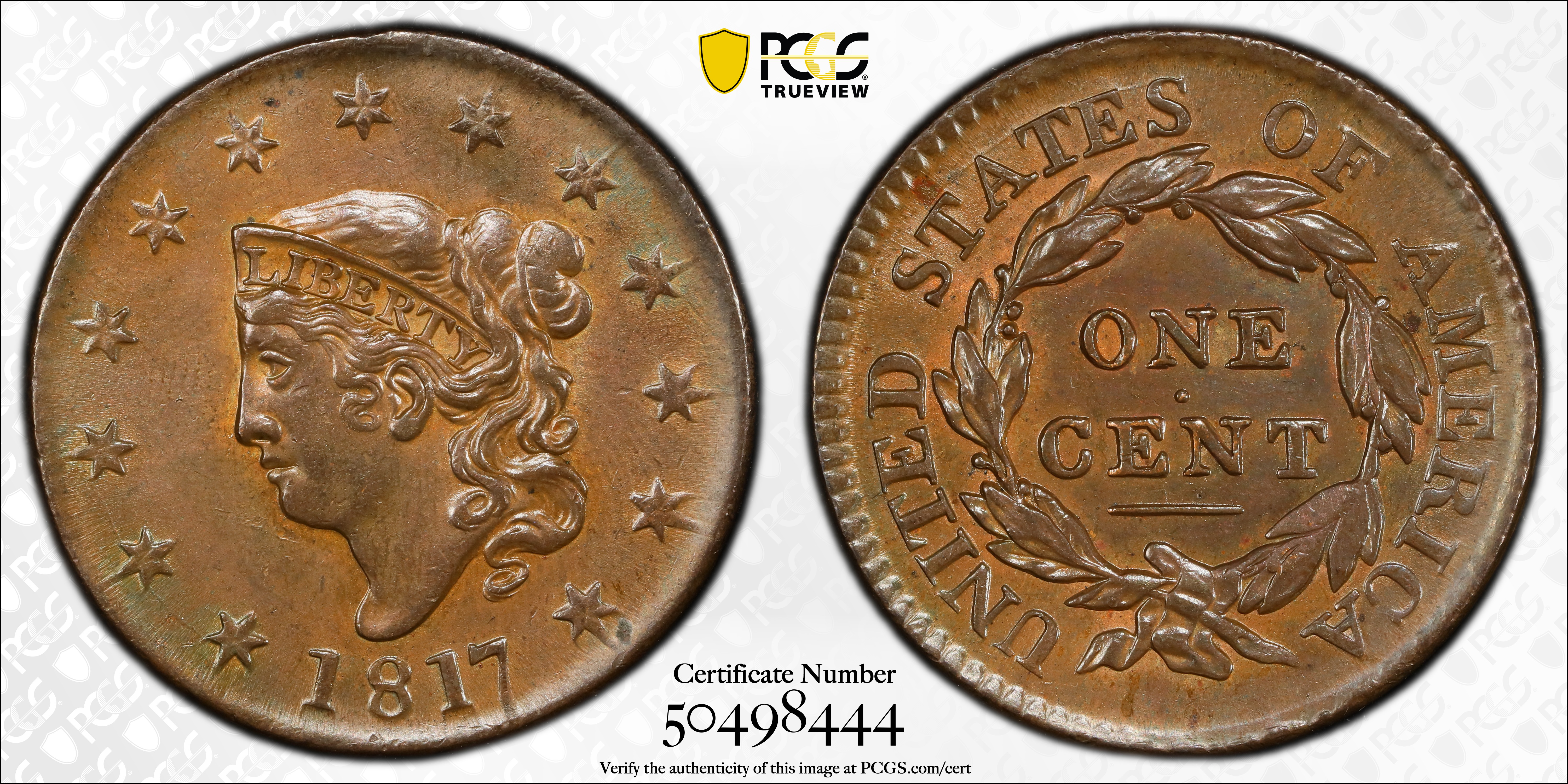 1817 1C 13 Stars, BN AU58+ BN Certification #50498444, PCGS #1594