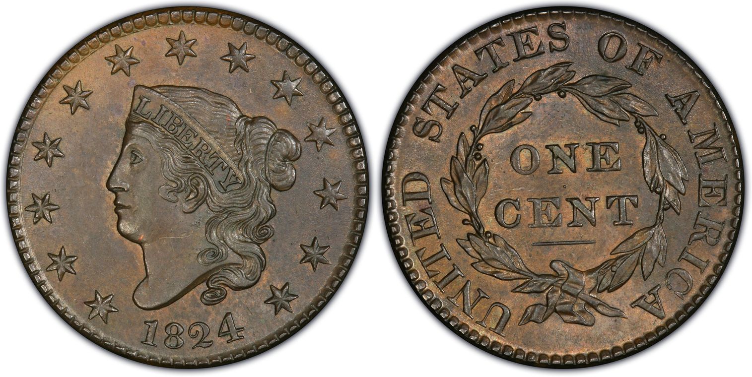 1824 Large Cents come in two major varieites: Normal Date and an 1824/1 overdate. This narrative covers the Normal Date.