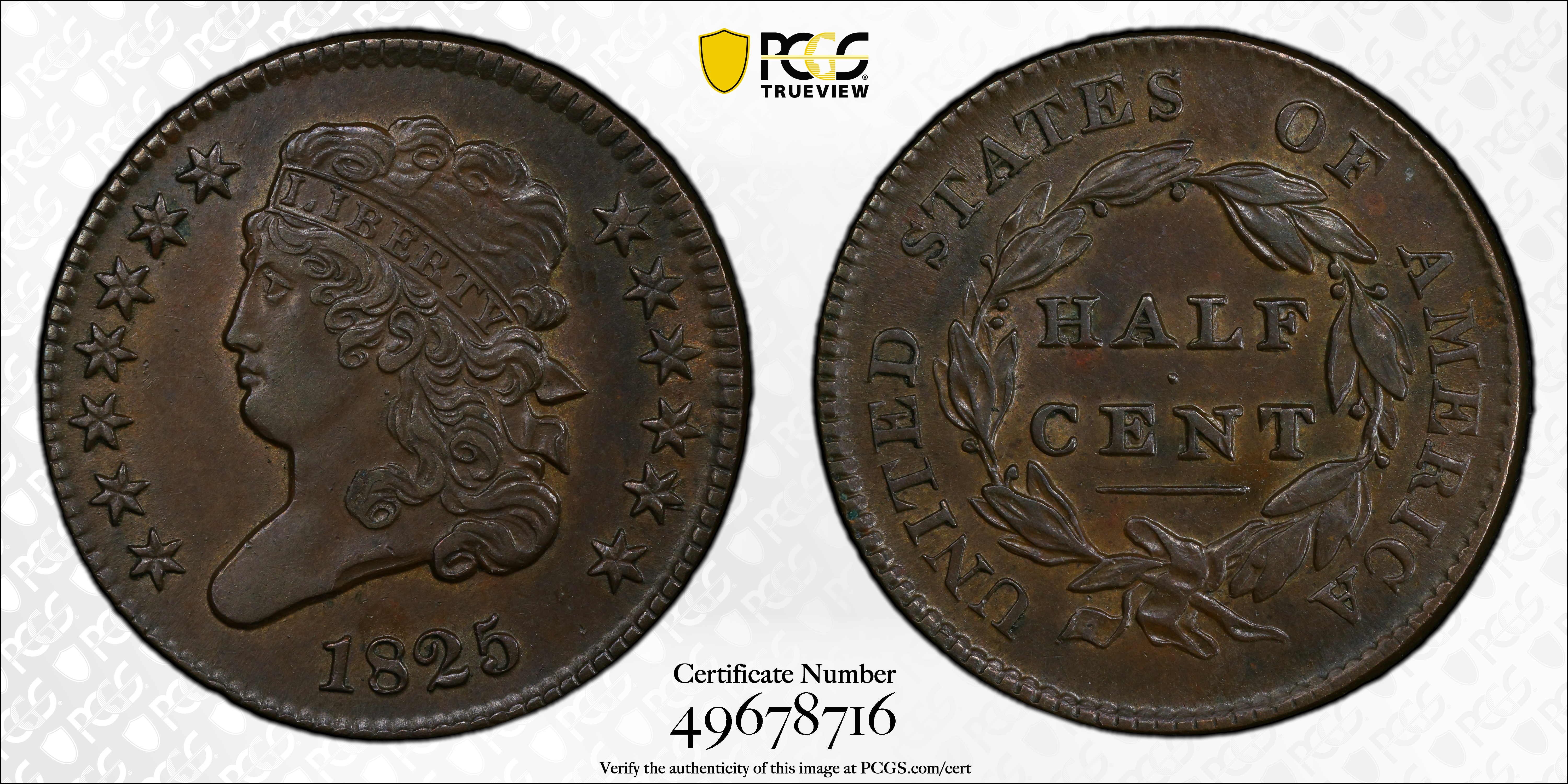 1825 1/2C, BN AU55BN Certification #49678716, PCGS #1141