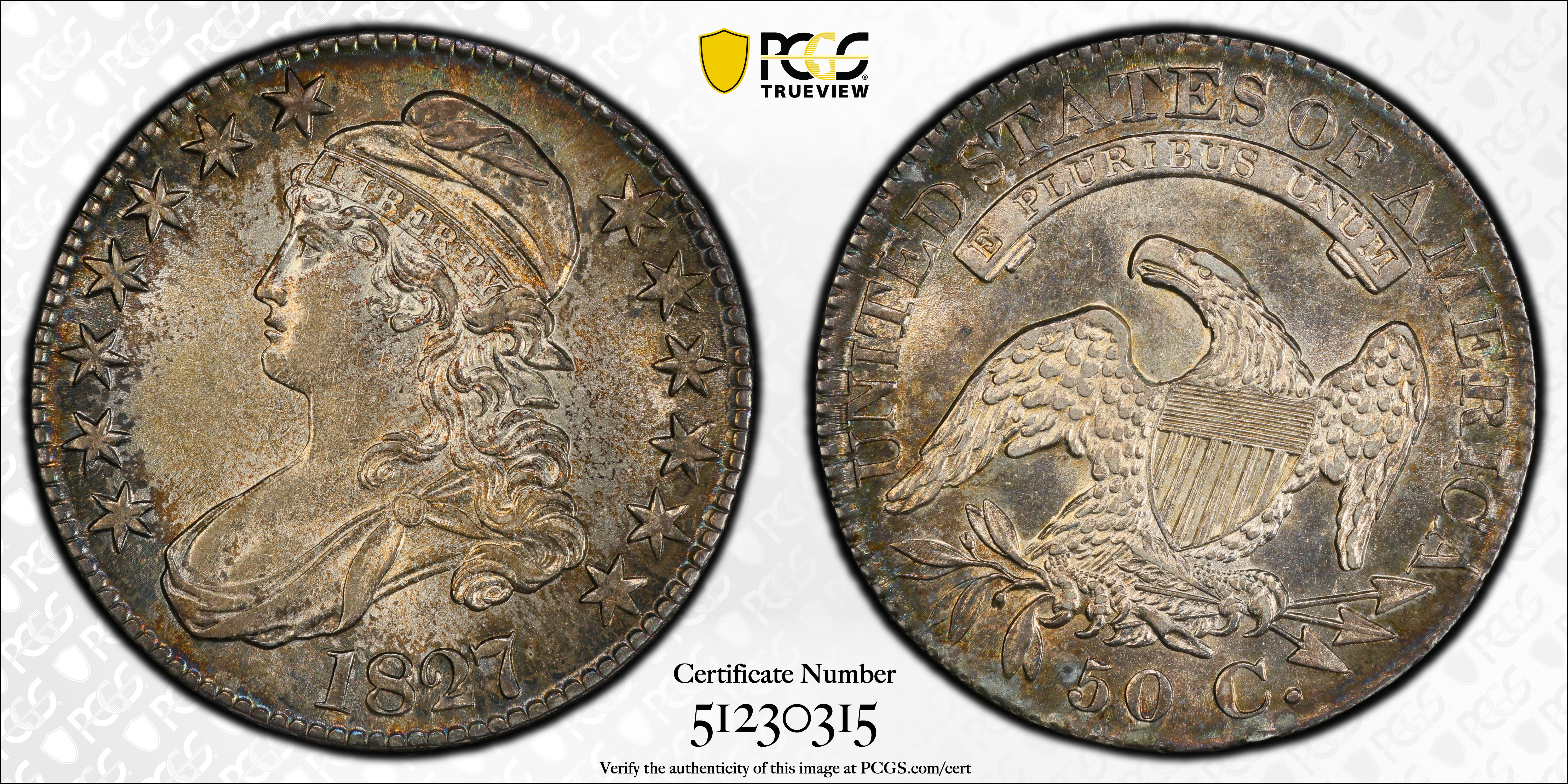 1827 Half Dollars have the third highest mintage of the entire series, exceeded only by 1834 and 1836. However, they also contain some interesting varieties, including a 7 over 6 overdate and 2's which feature either a curled base or a flat base. The Square Base 2 is the most common of the major varieties, by a significant margin. This variety is common in all grades and can be found in Mint State with relative ease. The most common Mint State grades is MS-63, followed by MS-62, then MS-64. Gems are scarce and anything finer than MS-65 is very rare. According to the PCGS Population Report (as of June 2011), the finest 1827 Square Base 2 Half Dollar is a single MS67.