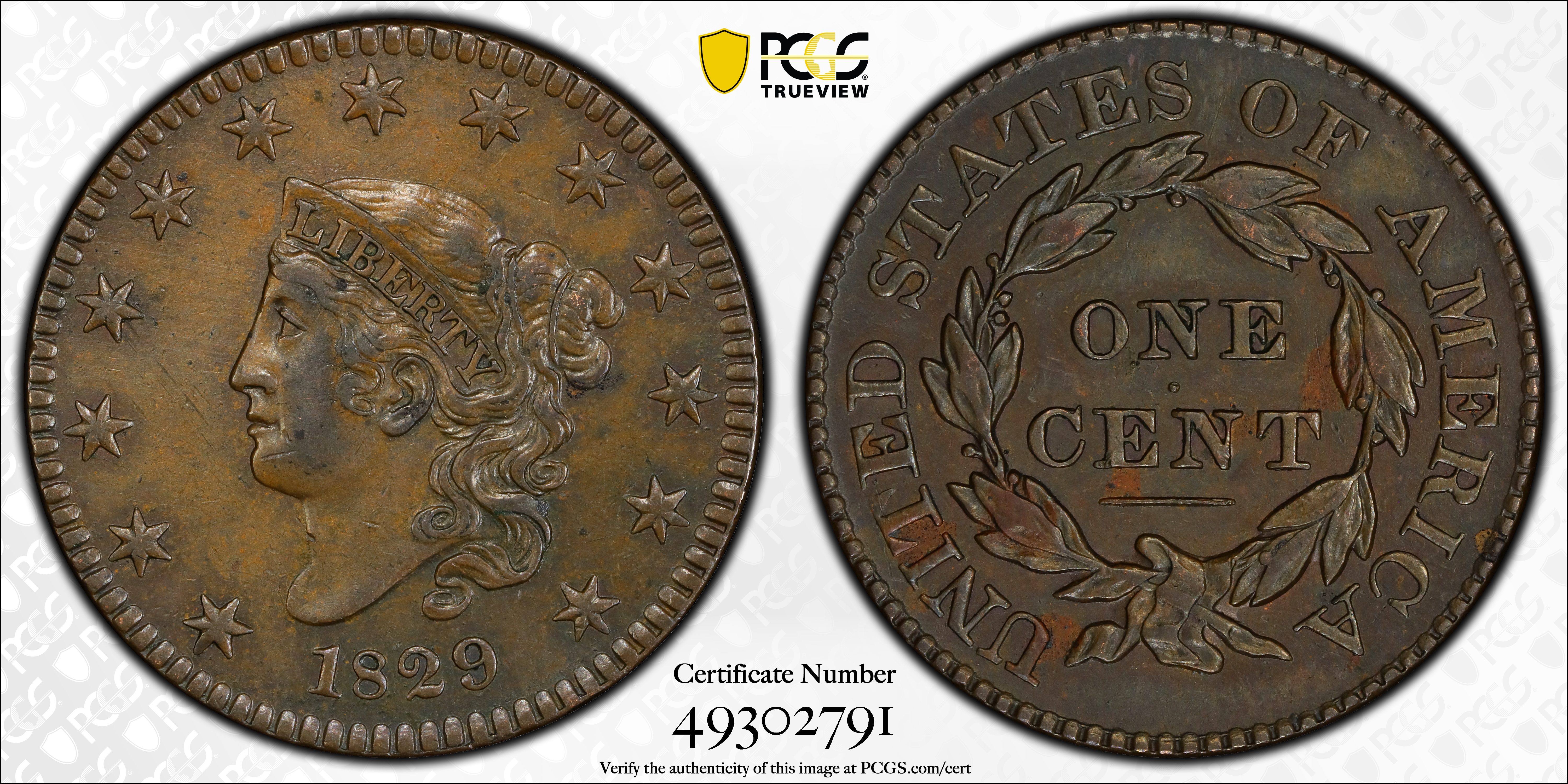 1829 1C Large Letters, BN AU50BN Certification #49302791, PCGS #1663