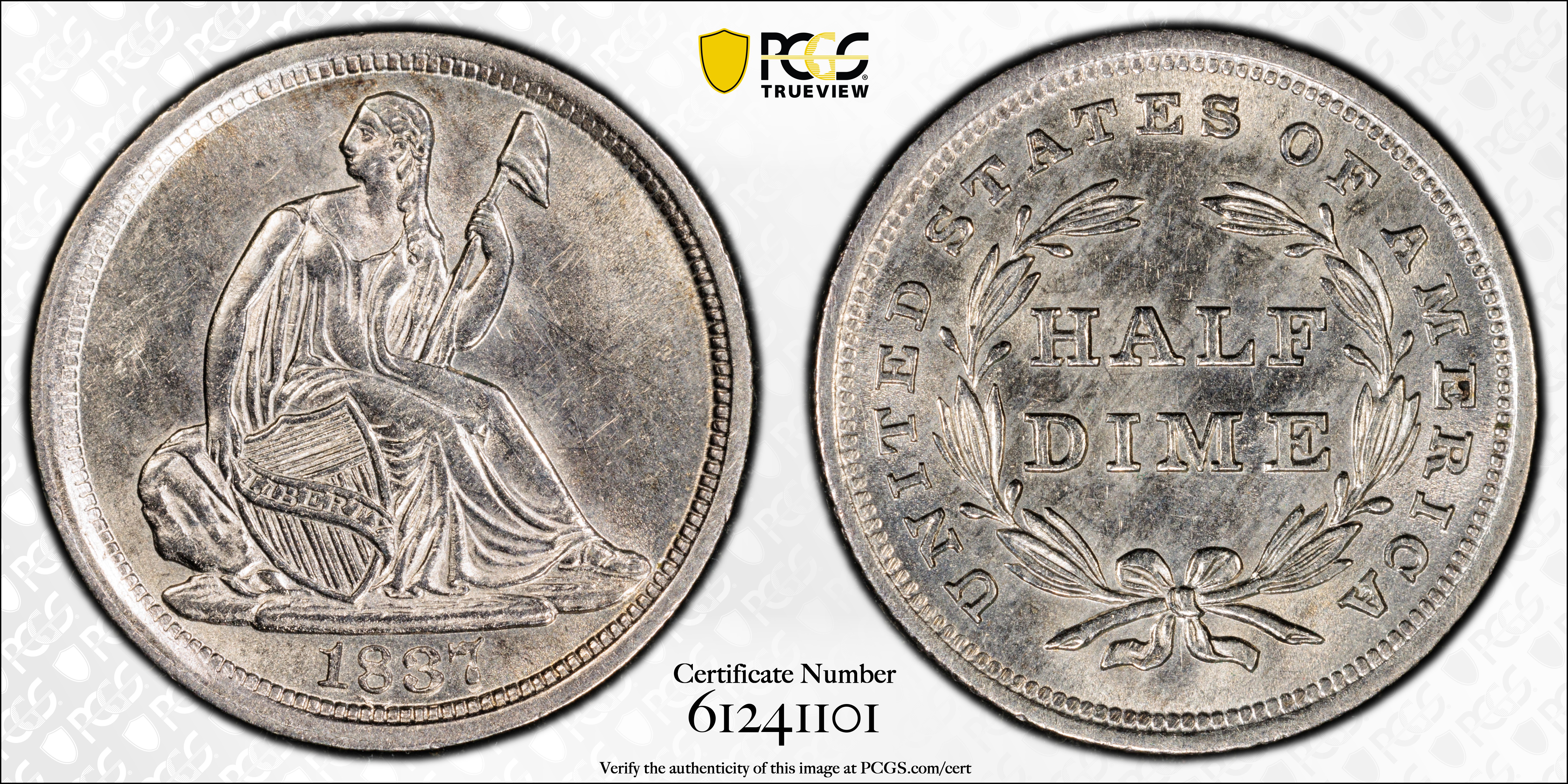 In 1837, the U.S. Mint introduced a new Half Dime and Dime, both with Christian Gobrecht's Seated Liberty design (these beautiful little coins are often called "mini-Gobrechts" after the new silver dollars of 1836). 1837 Half Dimes are found with either Large or Small Dates. Neither variety is rare, but the Large Date version is more than twice as plentiful (according to the April 2012 PCGS Population Report). Collectors should have no difficulty finding Mint State examples up through MS65, but this date becomes very scarce in MS-66, and extremely rare in MS67. The finest examples certified by PCGS include three PCGS MS67s.