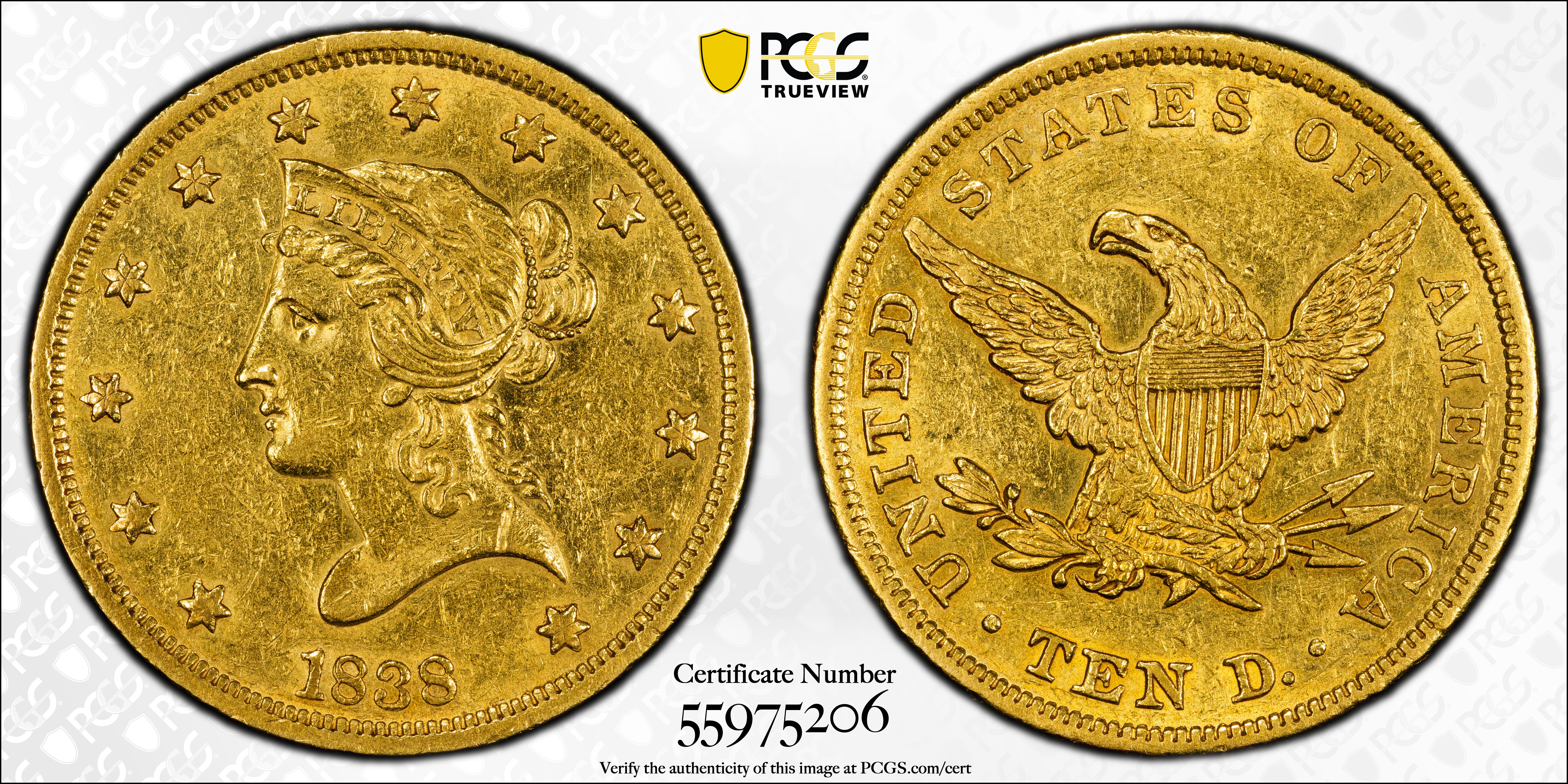 1838 $10 AU50 Certification #55975206, PCGS #8575