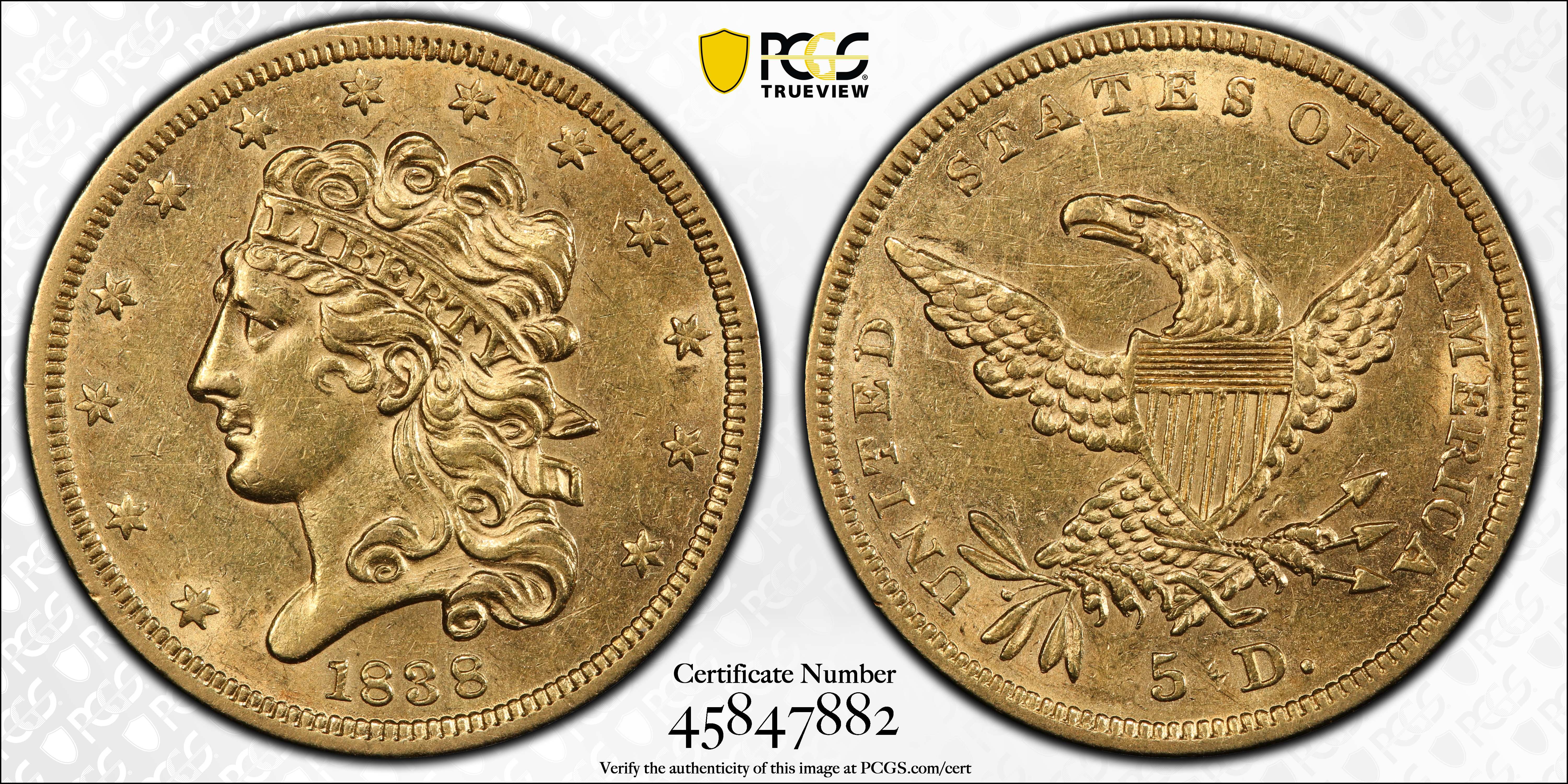 1838 $5 AU55 Certification #45847882, PCGS #8176