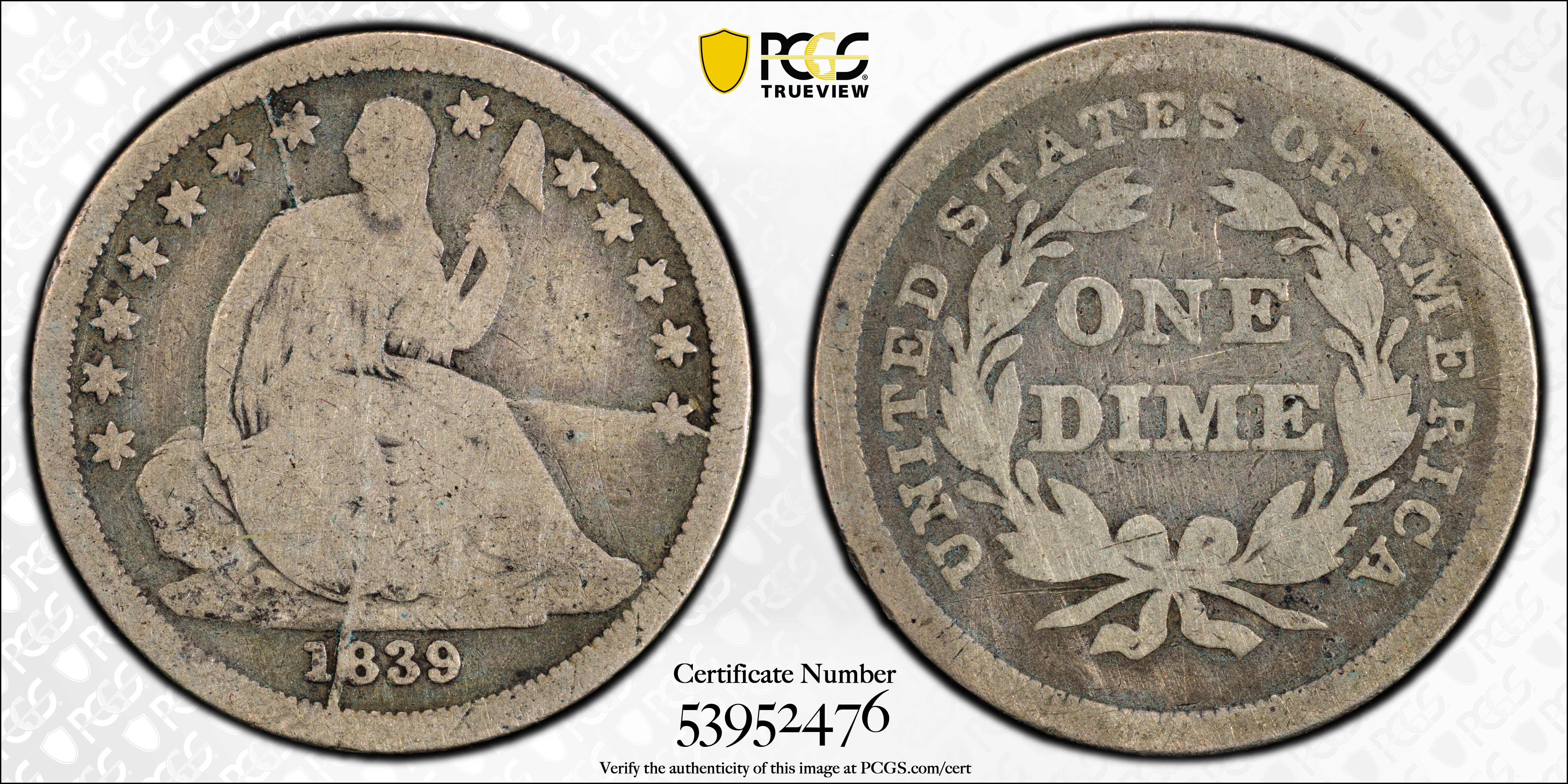 1839 10C No Drapery, F-105c VG8 Certification #53952476, PCGS #537674