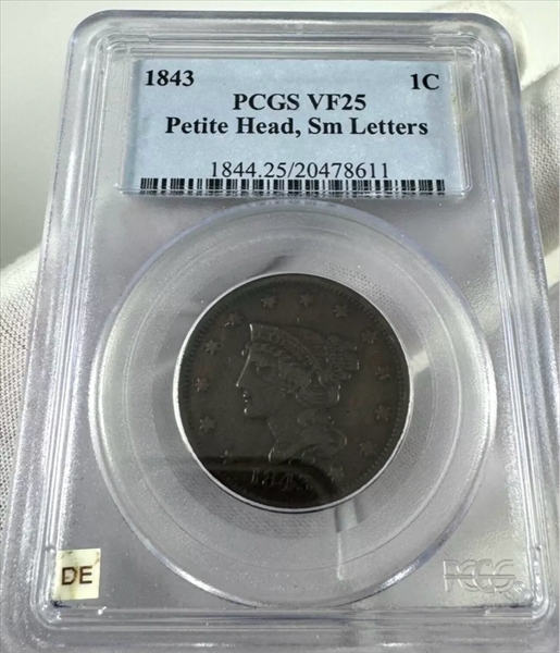 1843 1C Petite Head, Small Letters, BN VF25BN Certification #20478611, PCGS #1844