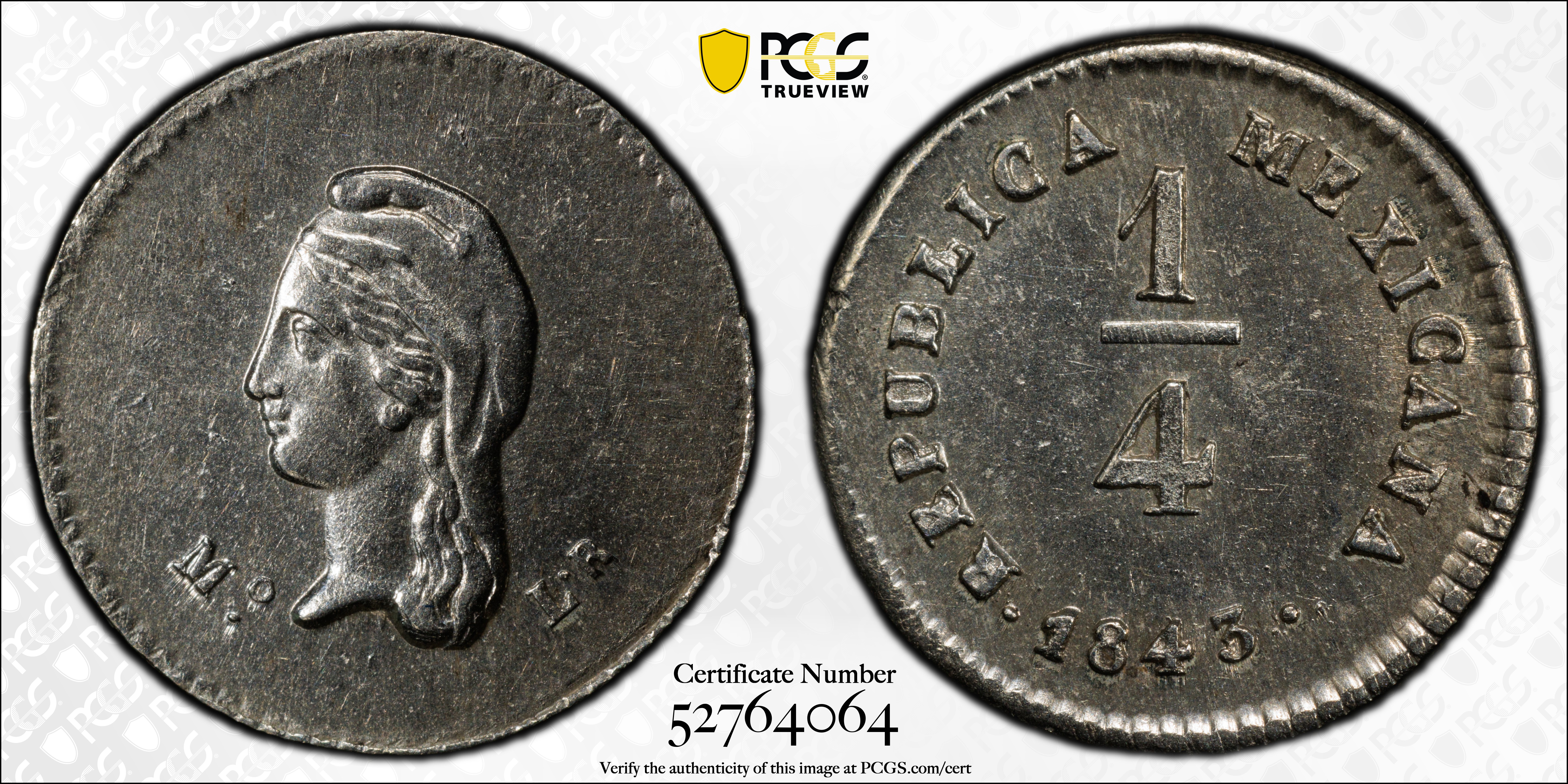1843-Mo LR 1/4 R MS62 Certification #52764064, PCGS #516243