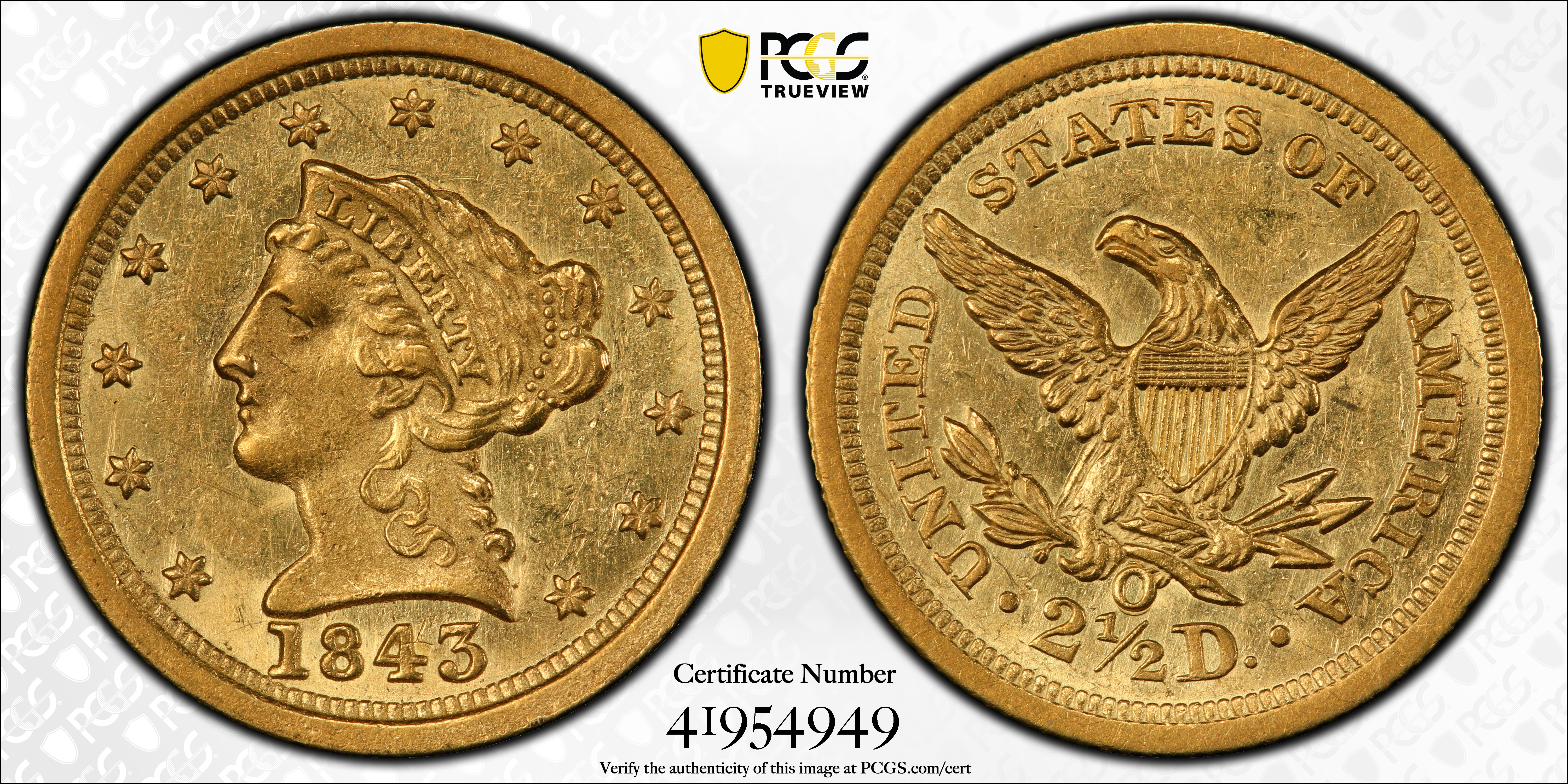 1843-O $2.50 Large Date MS62 Certification #41954949, PCGS #7732