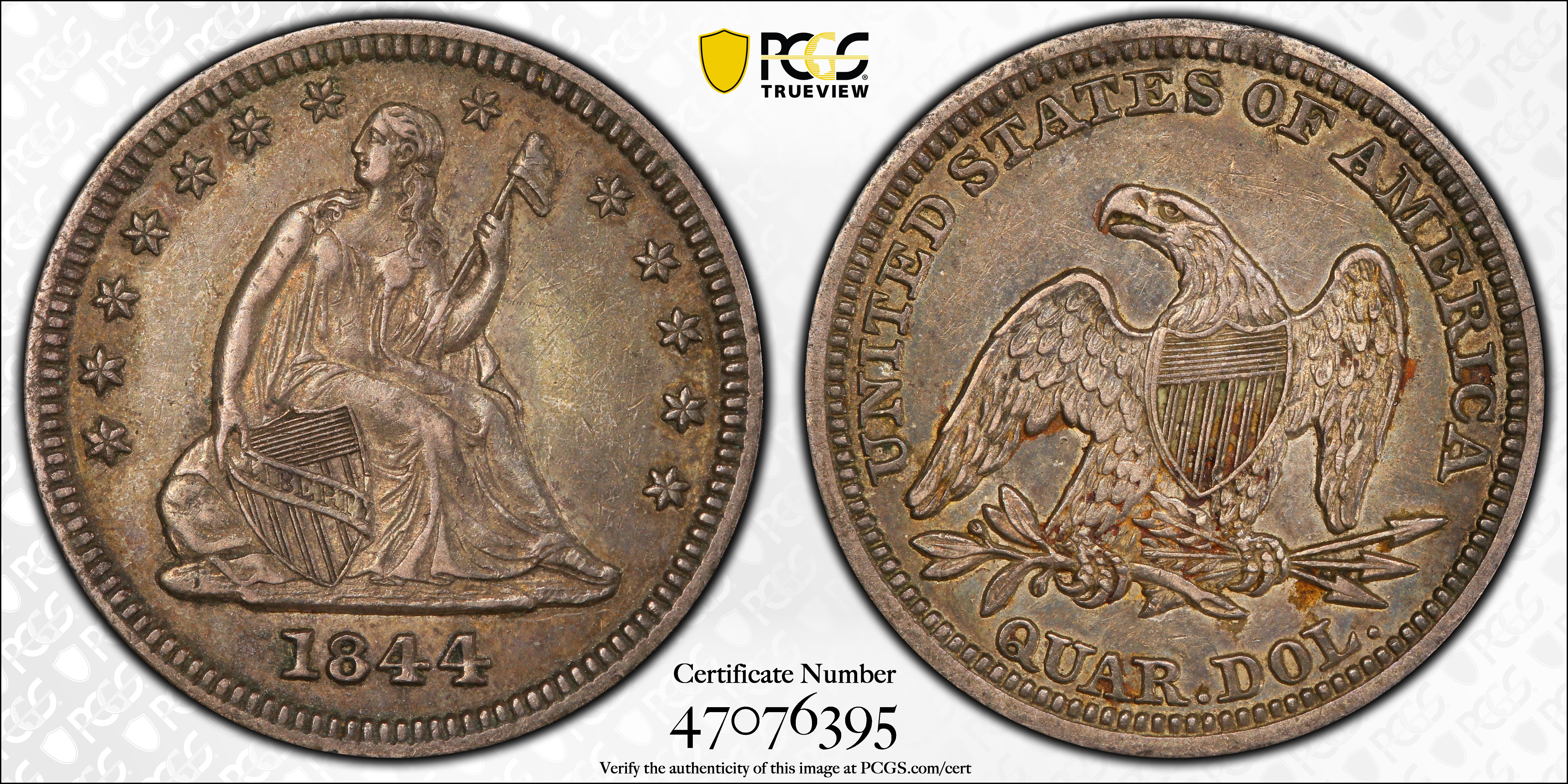 1844 25C AU53 Certification #47076395, PCGS #5406