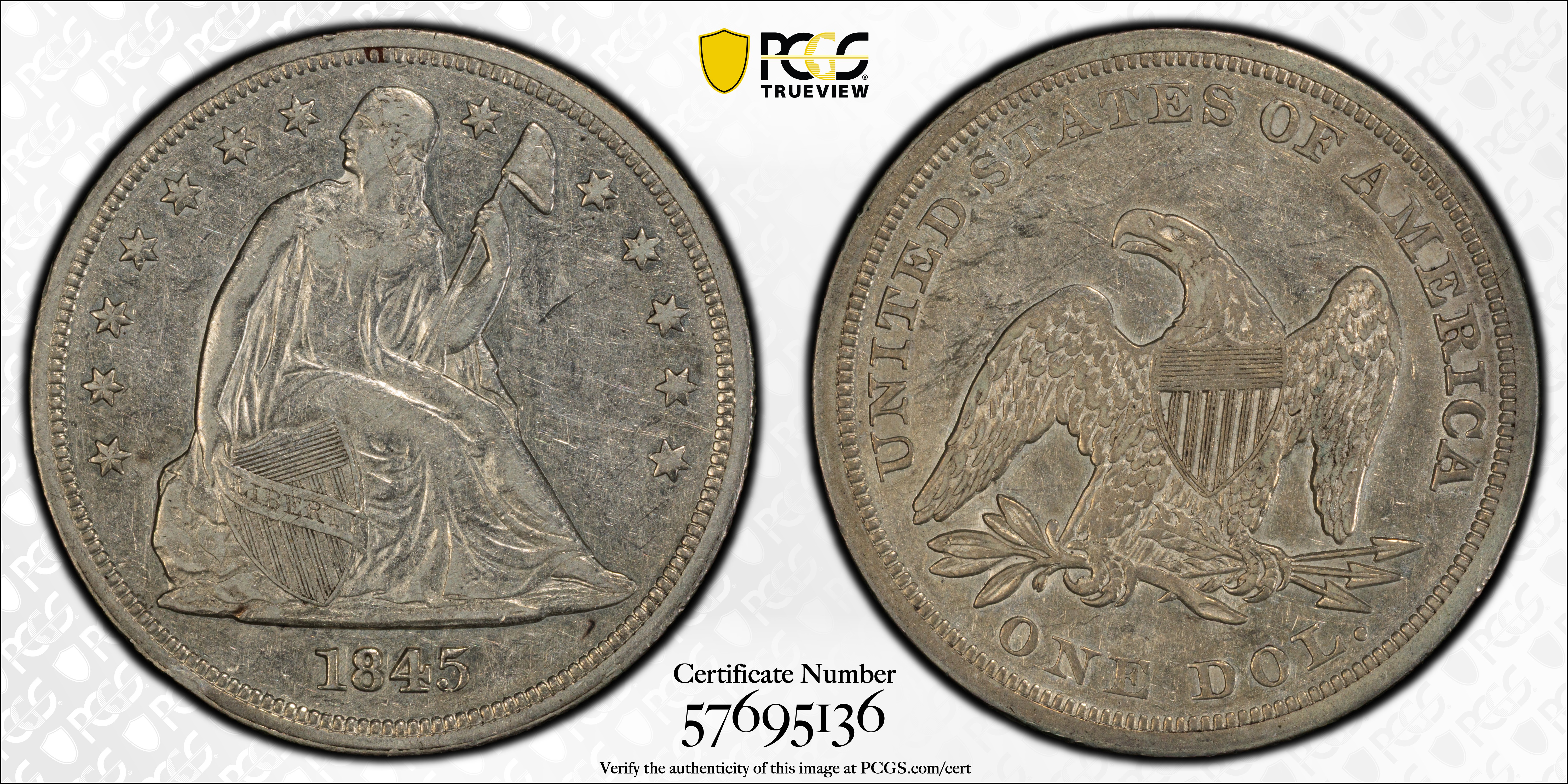 1845 $1 XF40 Certification #57695136, PCGS #6931