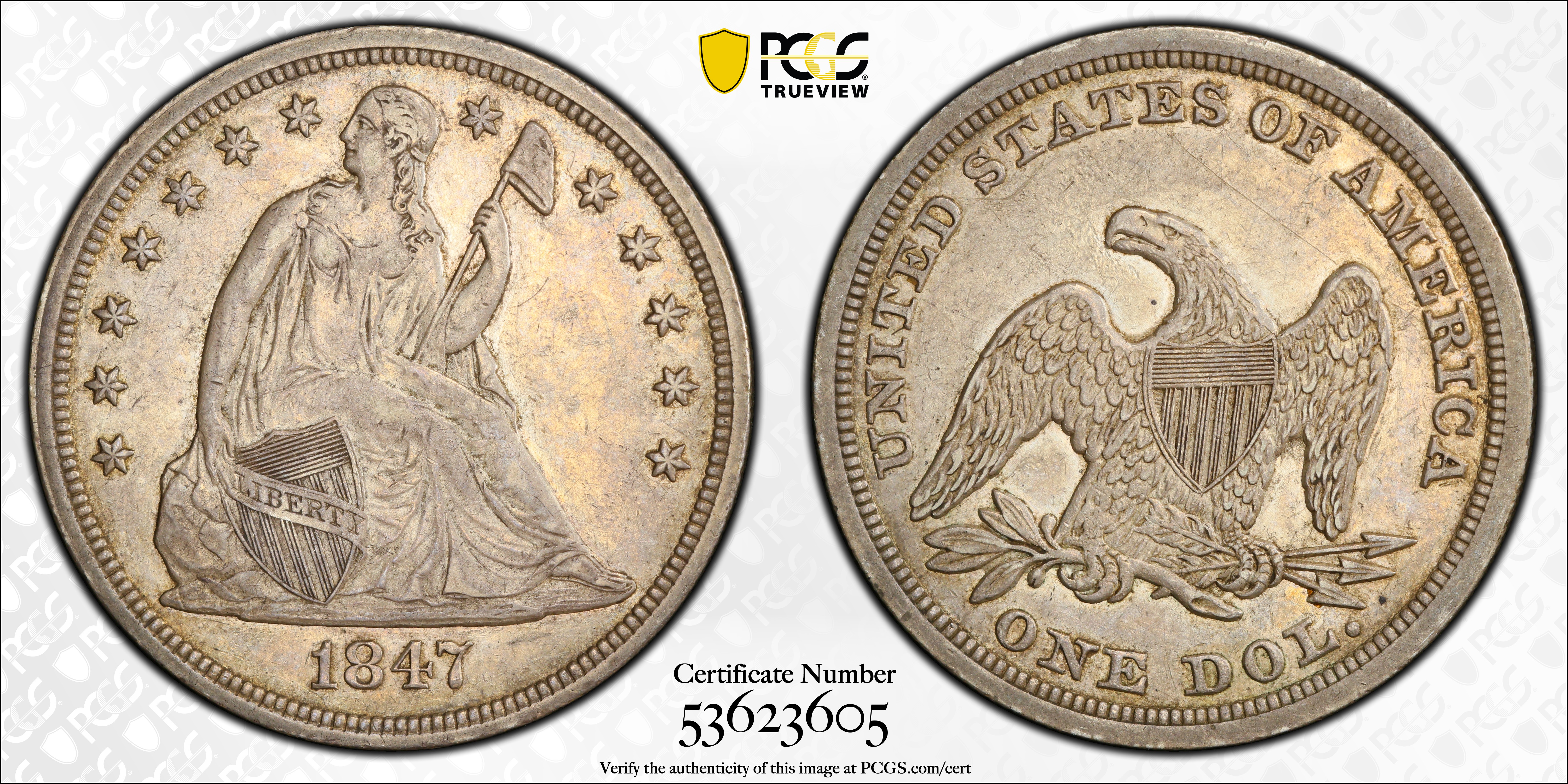 1847 $1 XF45 Certification #53623605, PCGS #6934