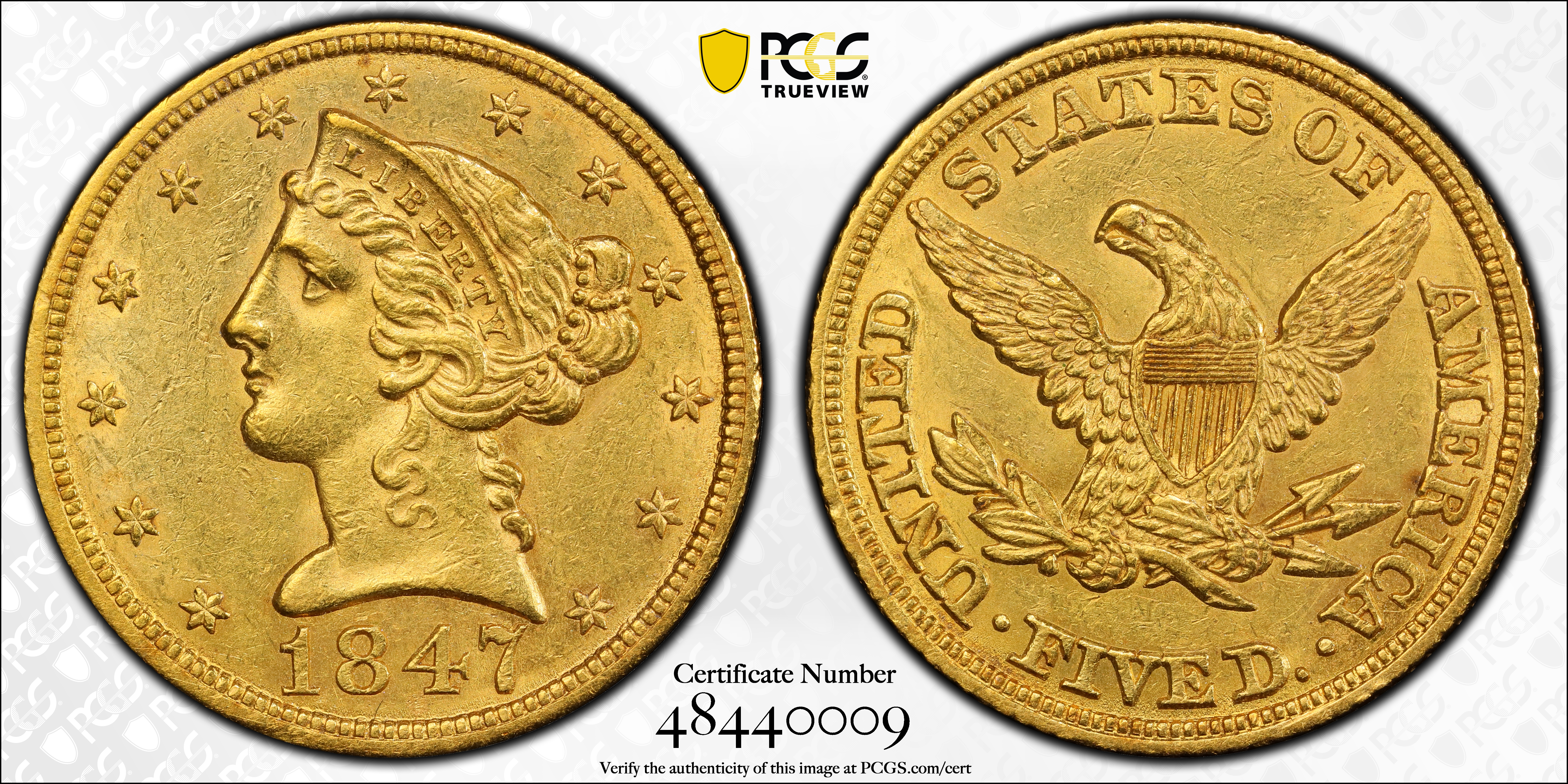 1847 $5 AU58 Certification #48440009, PCGS #8231