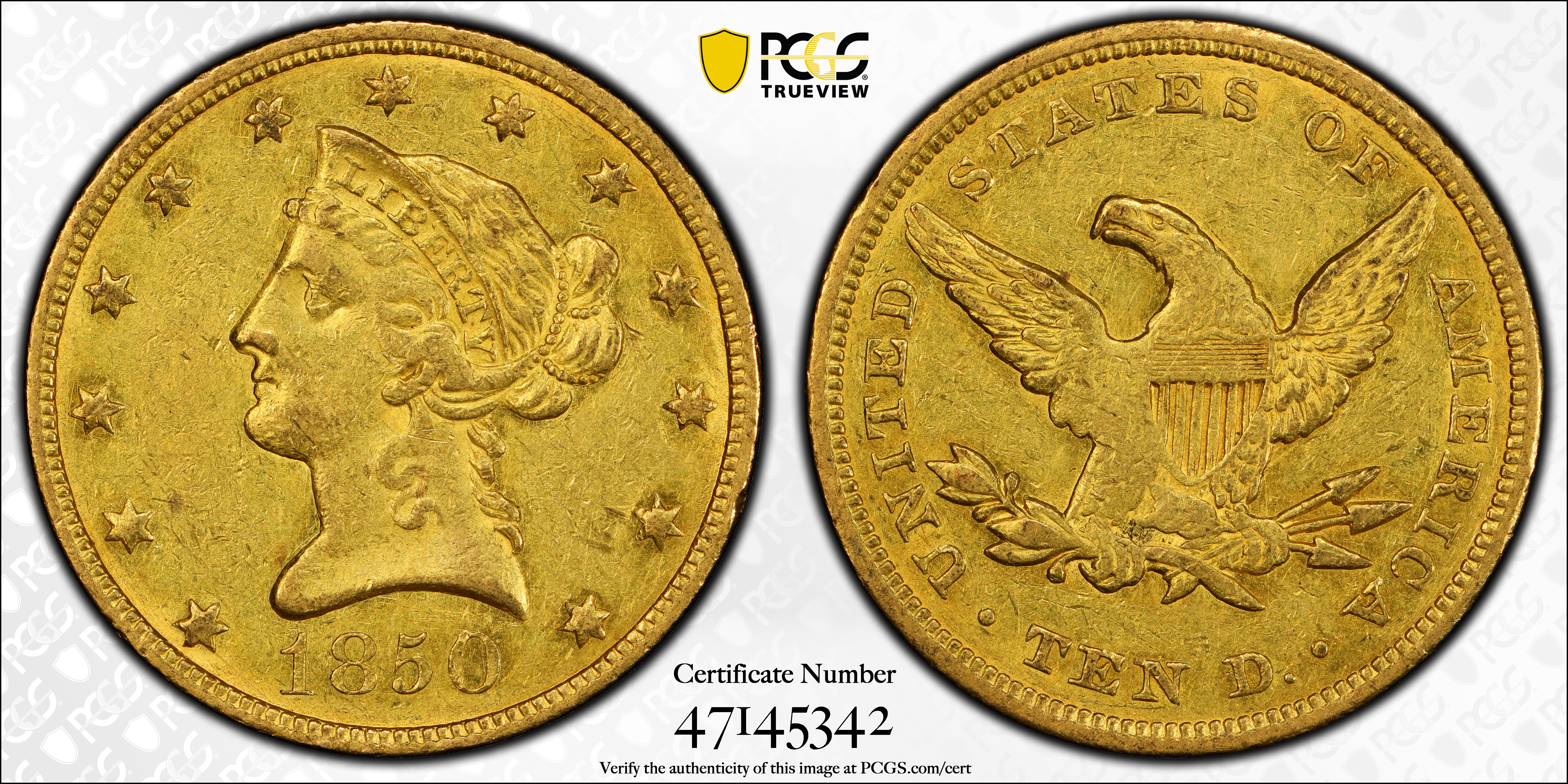1850 $10 Large Date AU55+ Certification #47145342, PCGS #8603