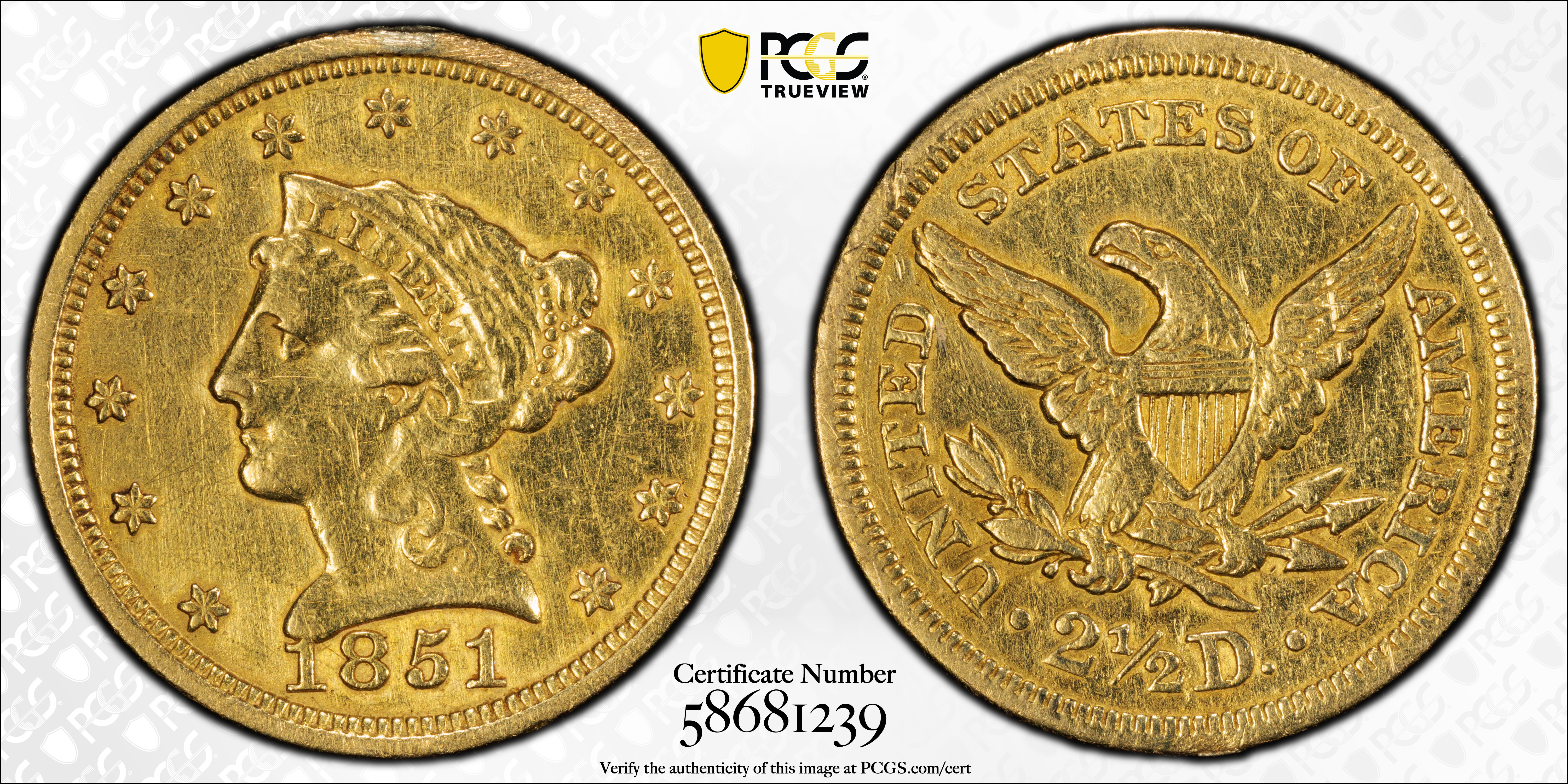 1851 $2.50 N1 Certification #58681239, PCGS #7759