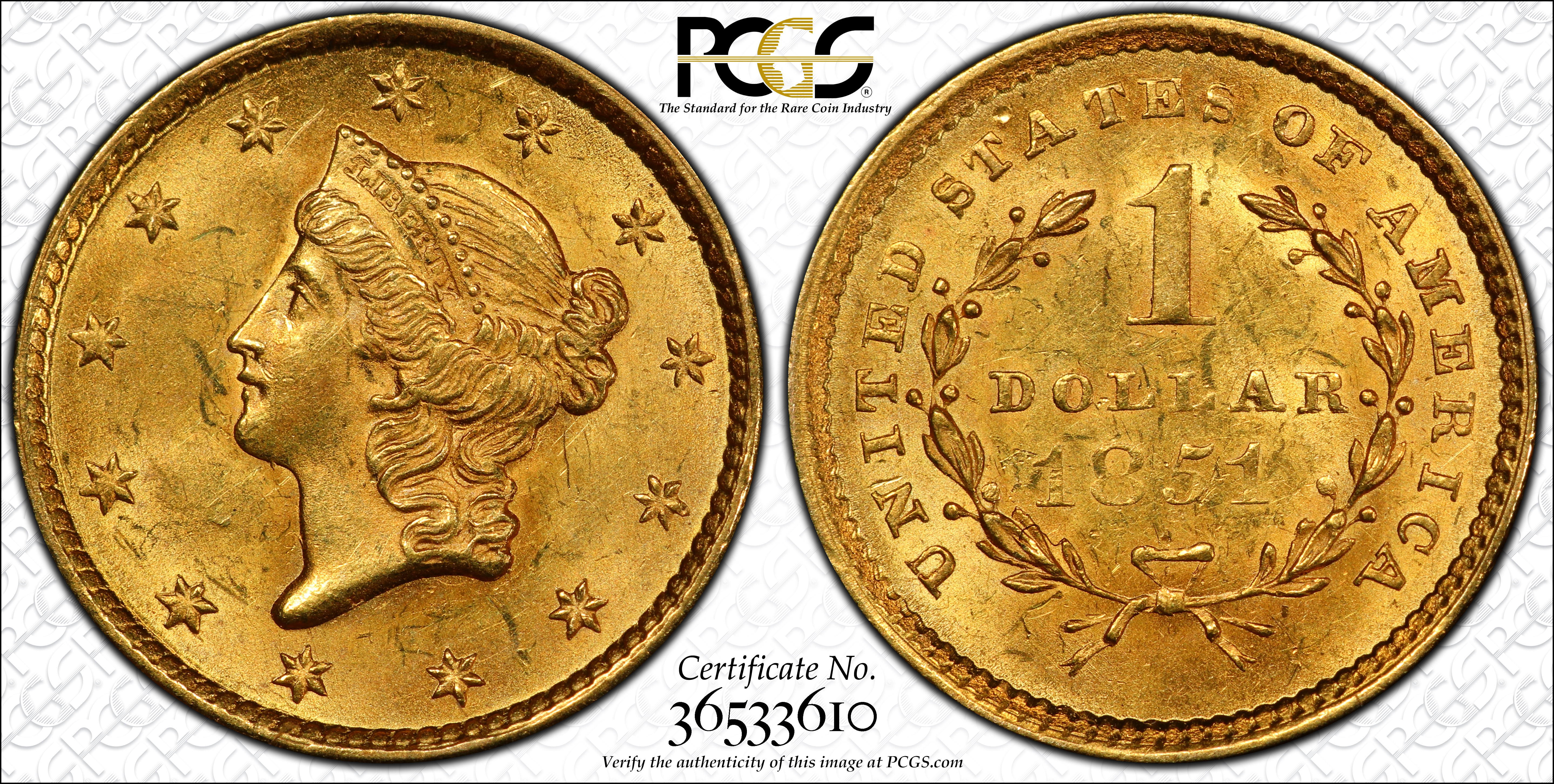 1851 G$1 MS62 Certification #36533610, PCGS #7513