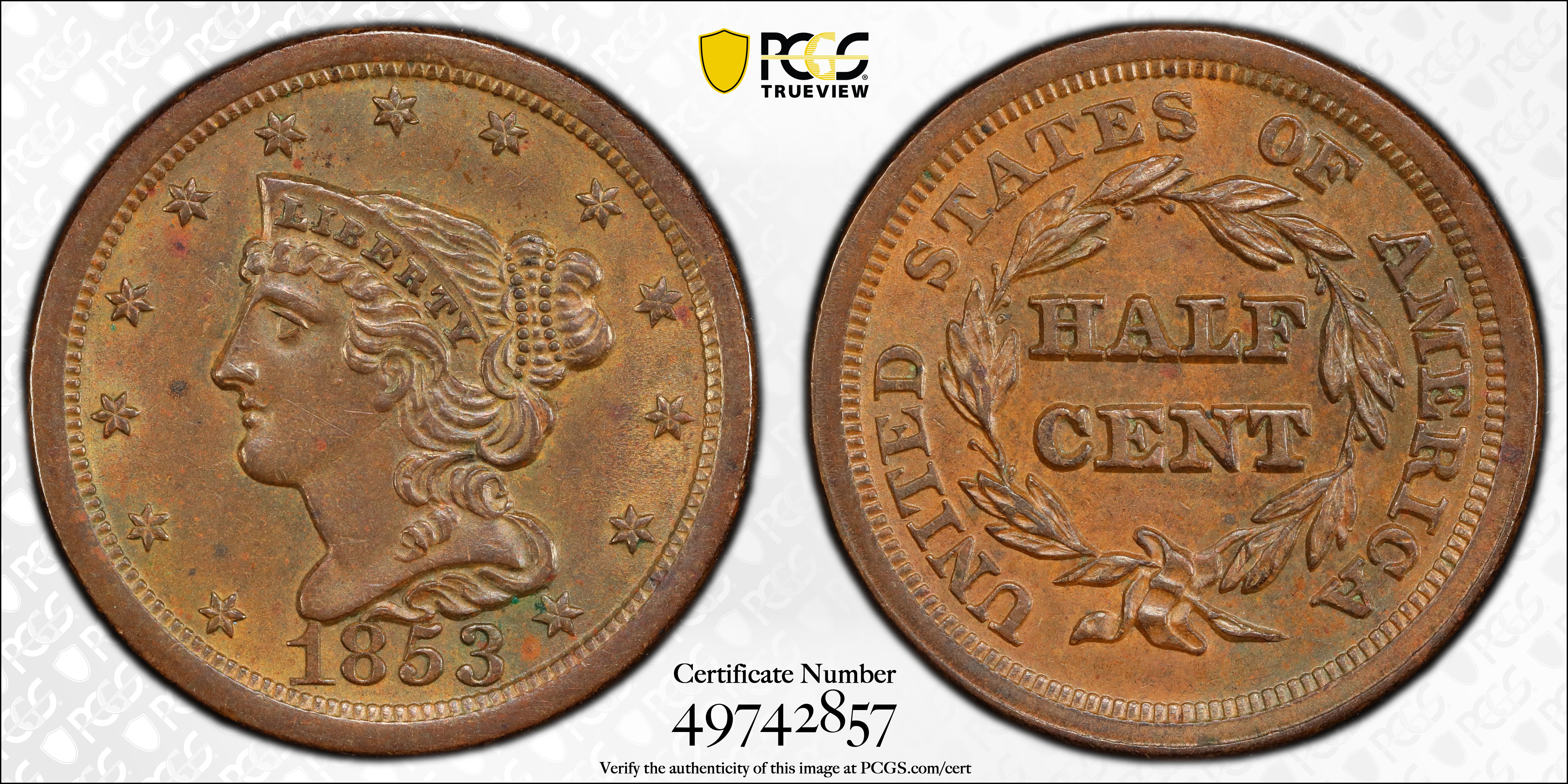 1853 1/2C, BN MS62BN Certification #49742857, PCGS #1227