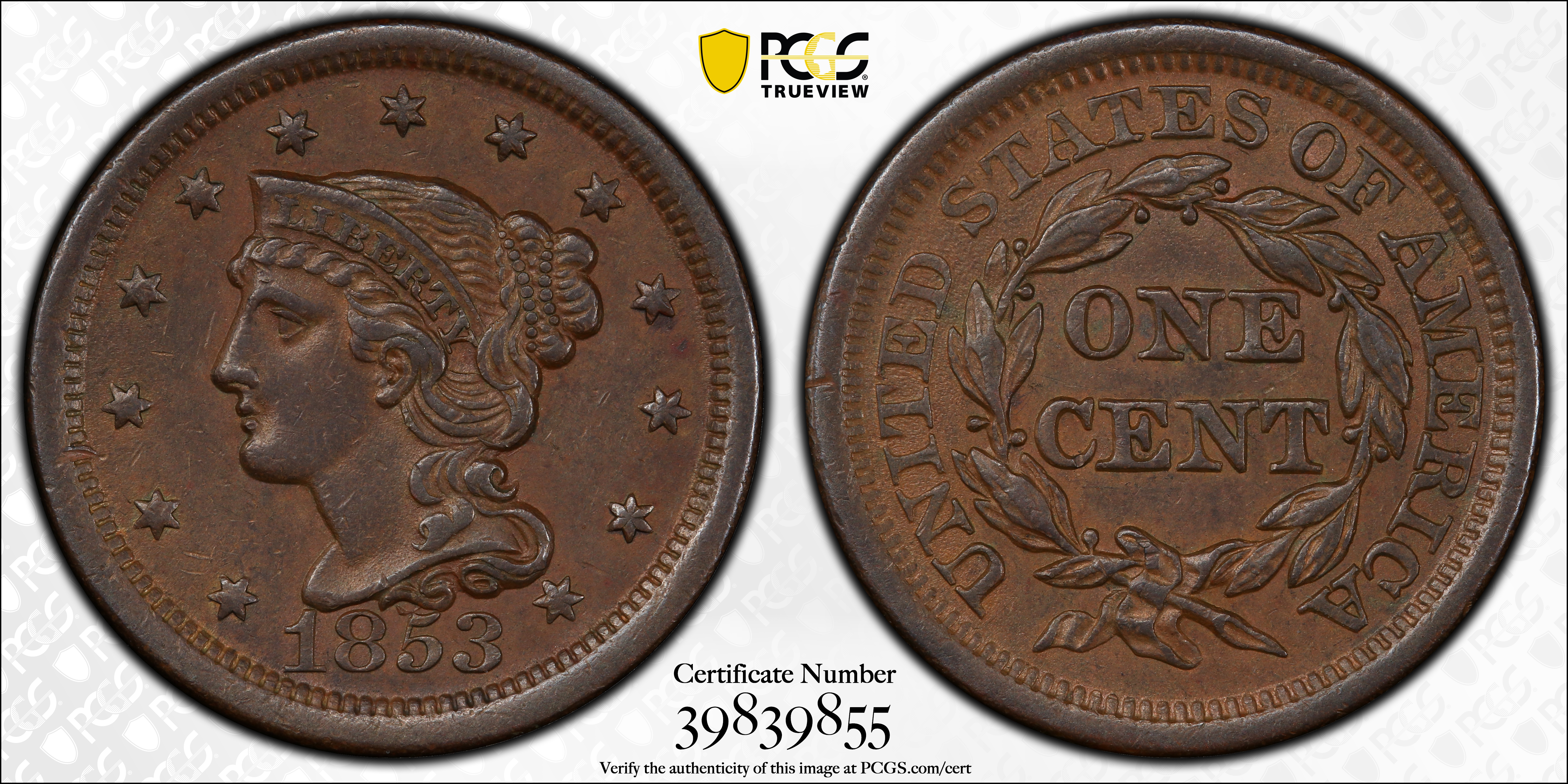 1853 1C Newcomb 15, BN AU50BN Certification #39839855, PCGS #406012