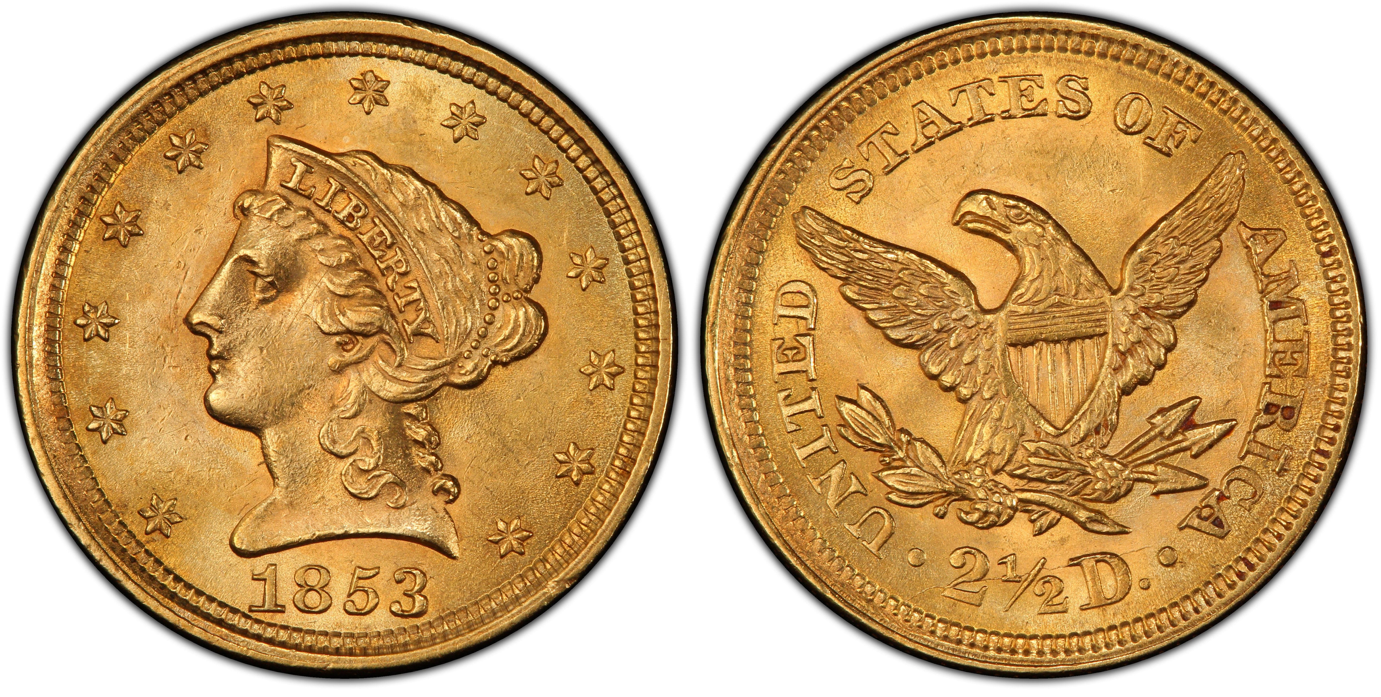 1853 $2.50 MS64+ Certification #82270221, PCGS #7767