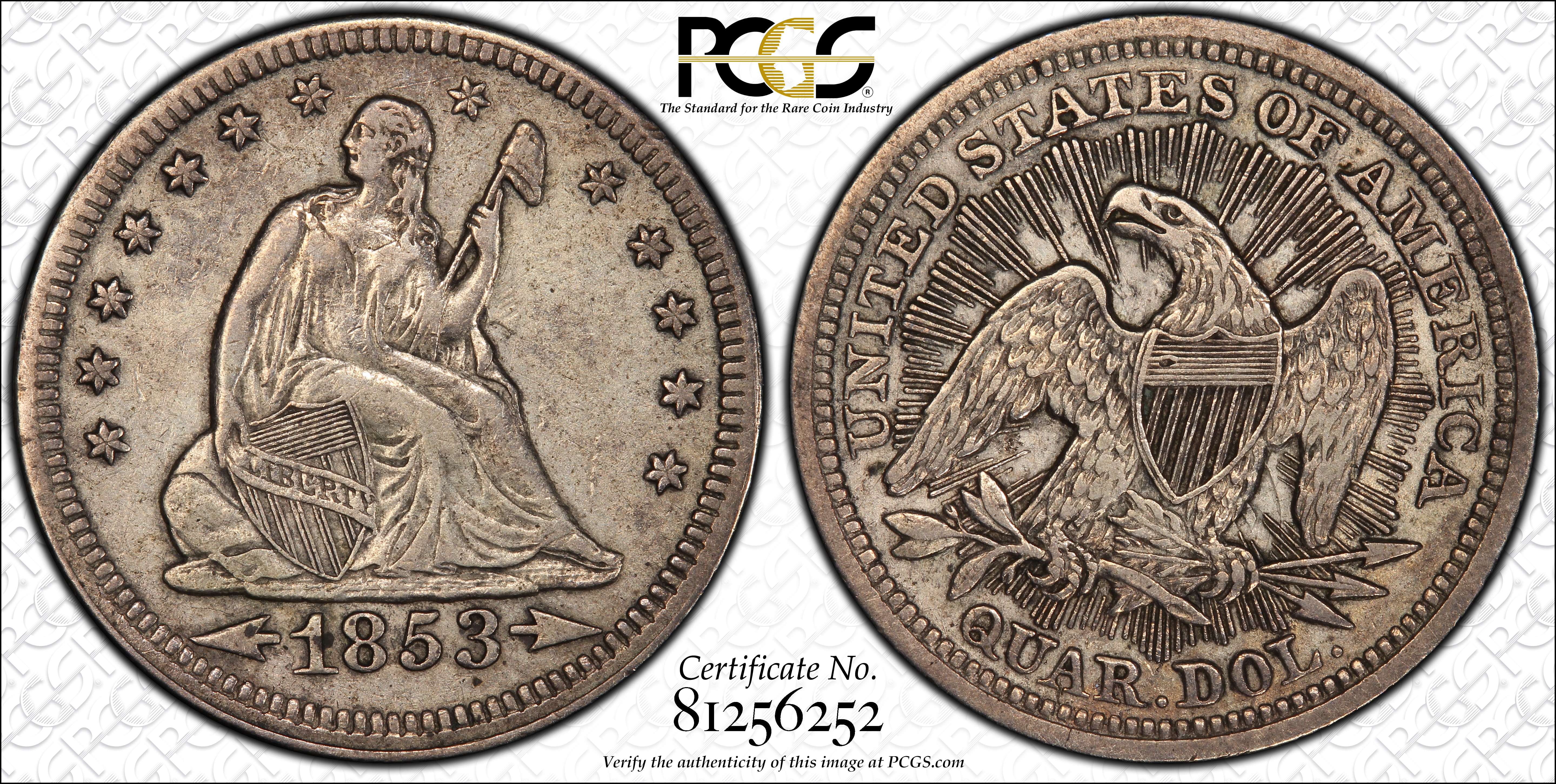 1853 25C Arrows and Rays XF40 Certification #81256252, PCGS #5426