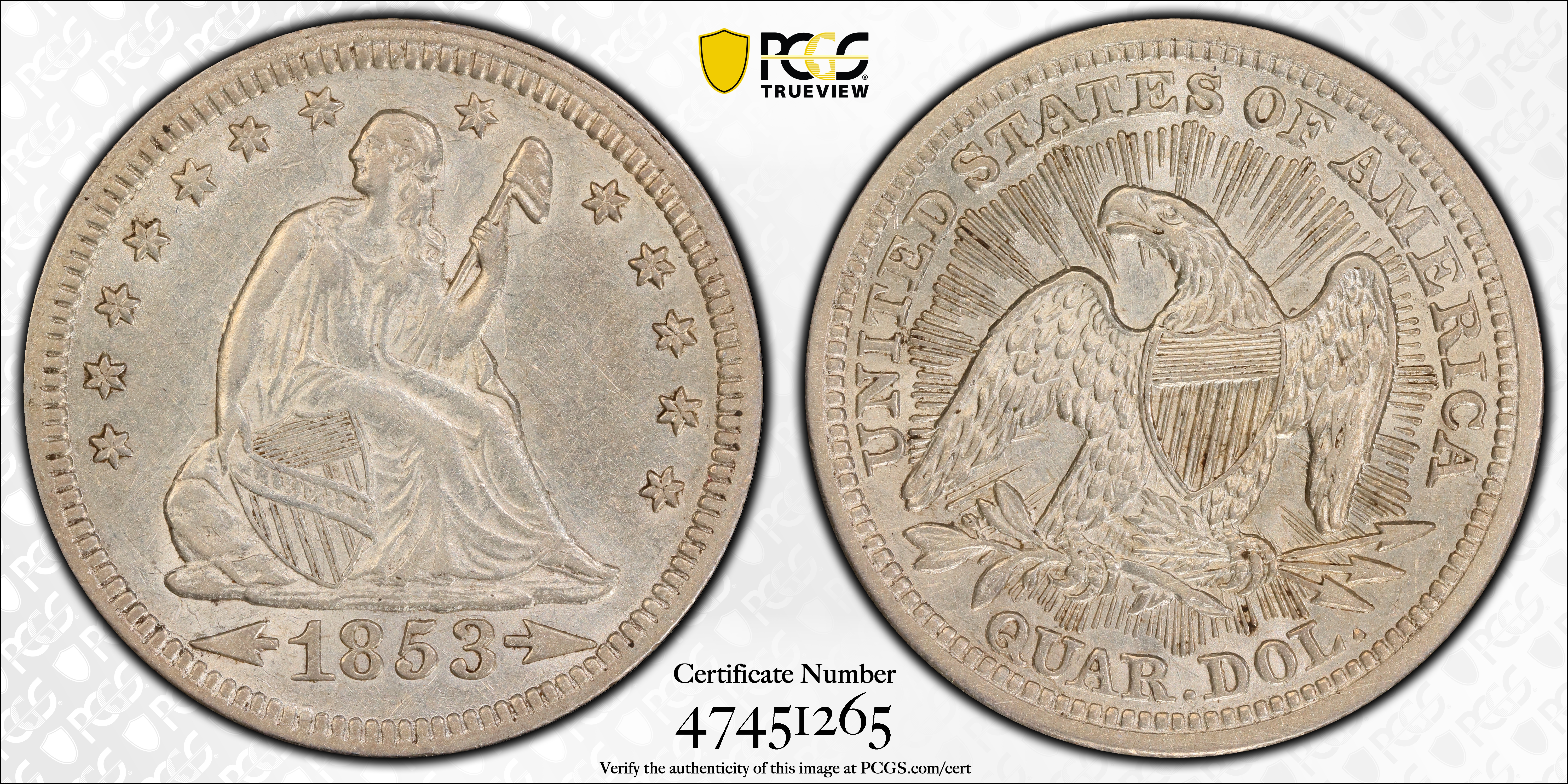 1853 25C Arrows and Rays AU53 Certification #47451265, PCGS #5426