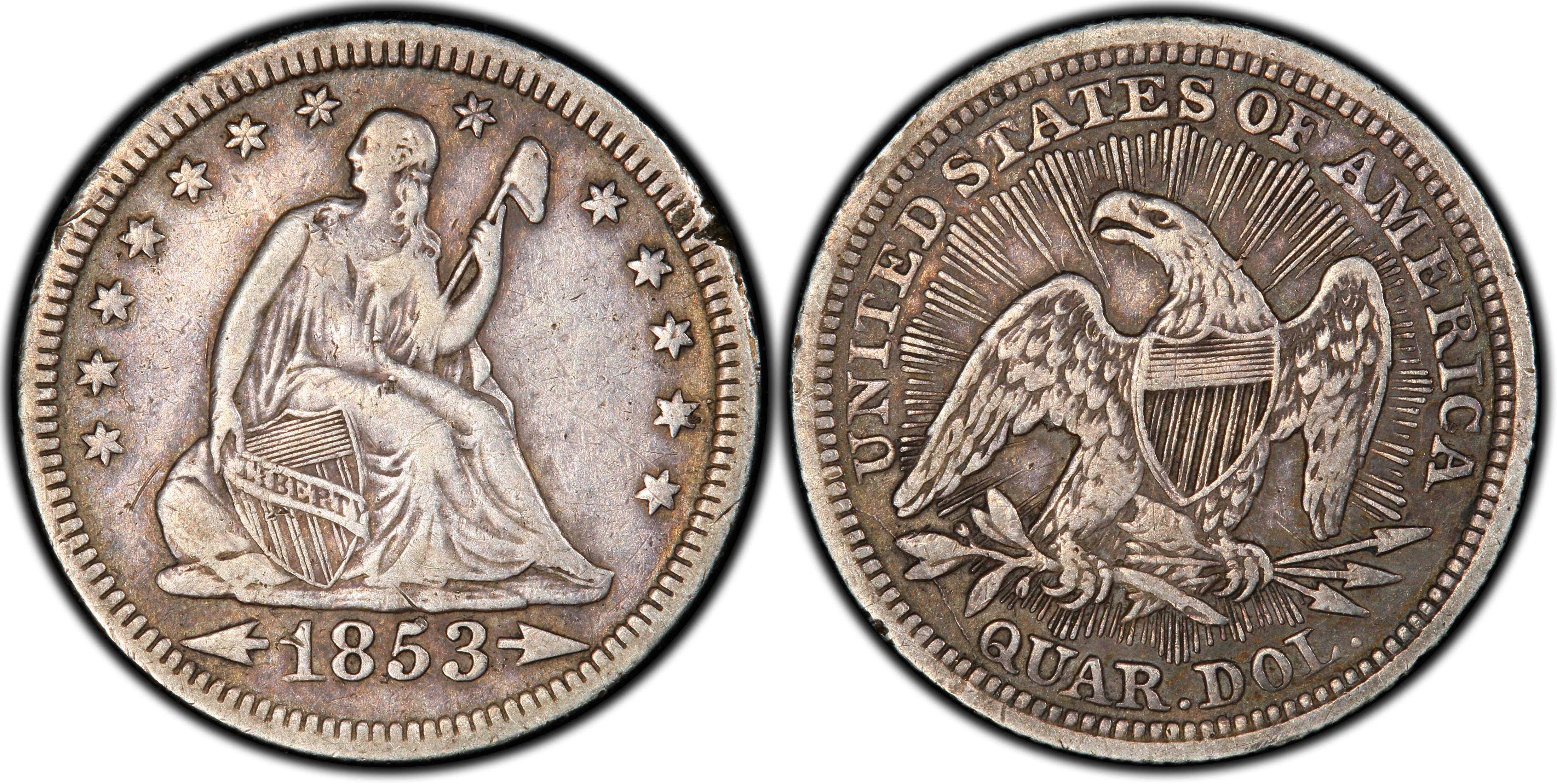 1853 25C Arrows and Rays VF25 Certification #06663668, PCGS #5426