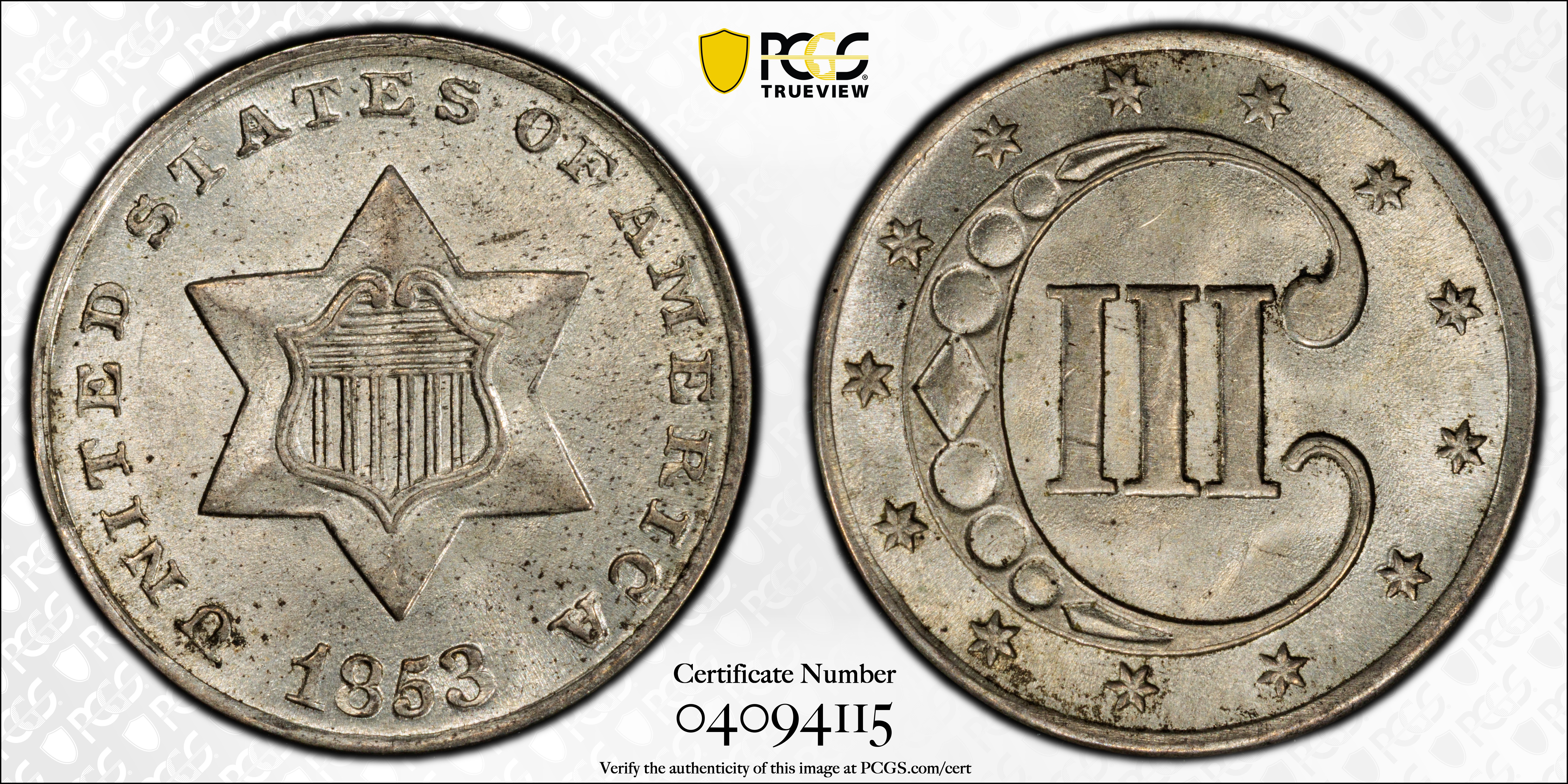 1853 3CS MS64 Certification #04094115, PCGS #3667