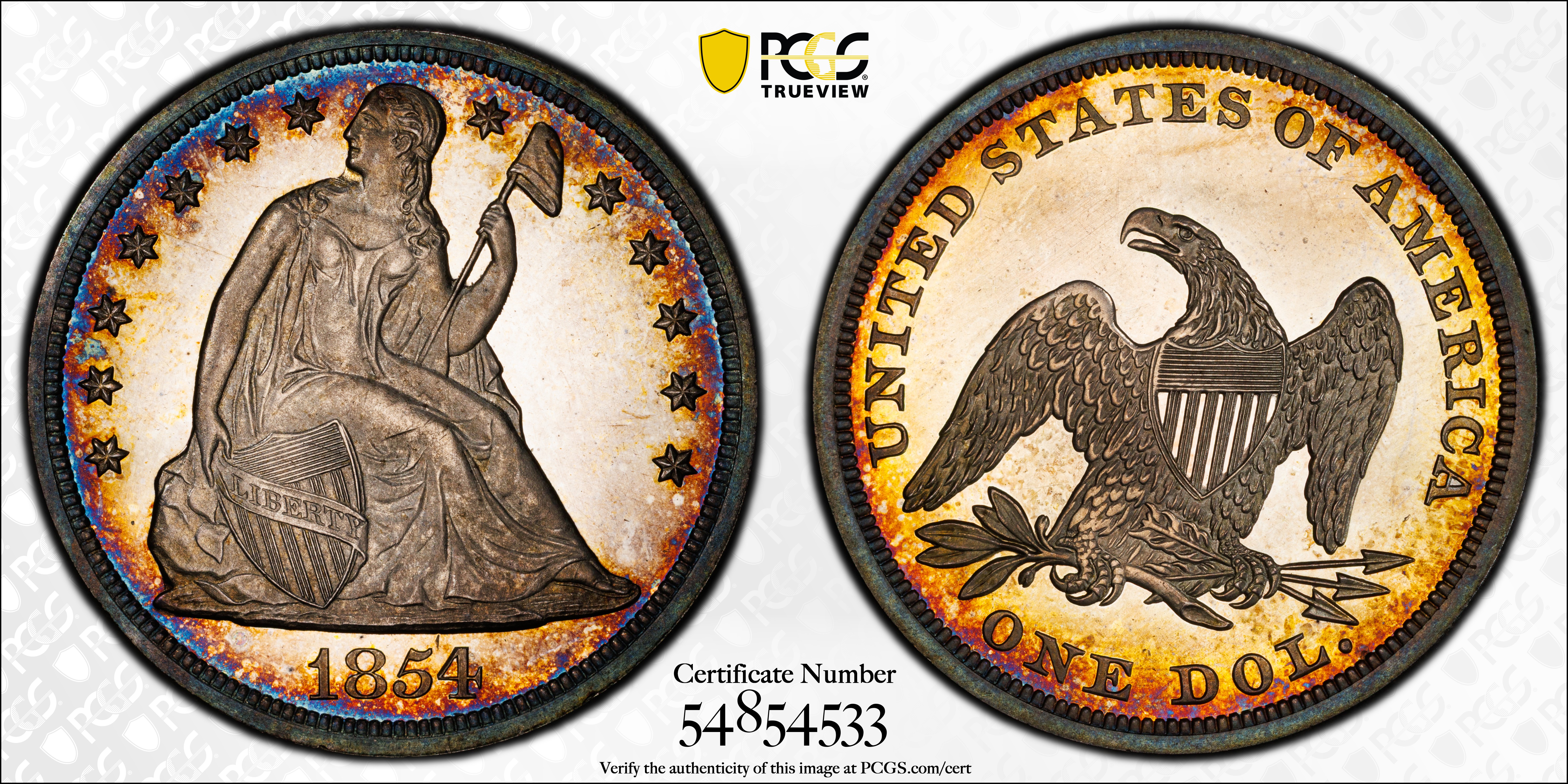 1854 $1, CAM PR65CAM Certification #54854533, PCGS #86997