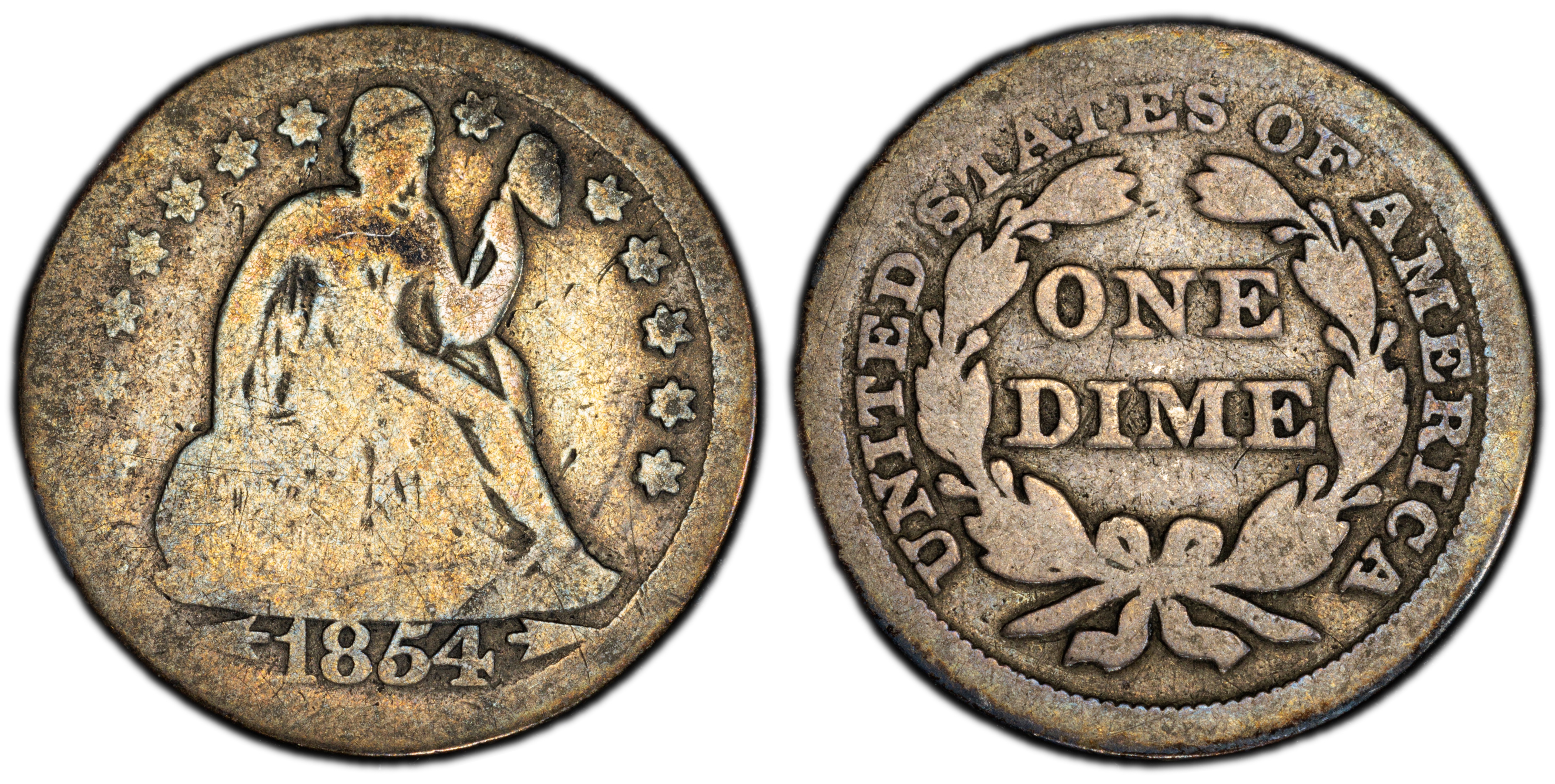 Dime researcher Gerry Fortin has identified twelve different die marriages used to produce 1854 Dimes. One of the die pairs (F-111) was used to strike both Mint State and Proof examples.