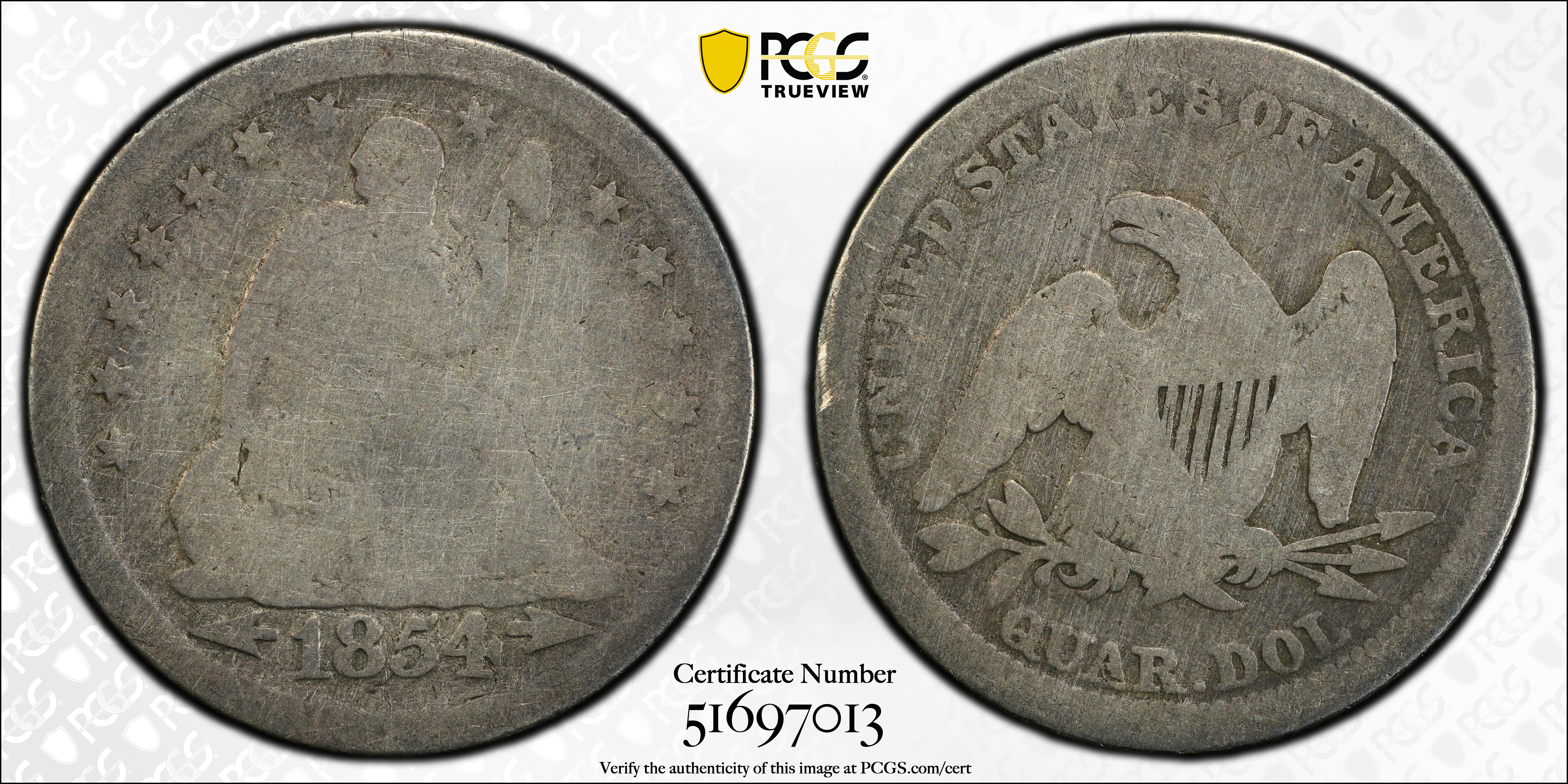 In 1854, the Mint decided to remove the rays from the back of the Quarter Dollars. From a technical standpoint, the rays created difficulties in striking the coins (more crevies in which to force the metal), and the obverse arrowheads were sufficient to let the public know that the new coins were different from the old (they were lighter). In 1854, the Phildalphia Mint struck nearly 13 million Quarter Dollars, creating an ample supply for both commerce and collectors. As a result, Mint State examples are quite common, especially in MS63 and MS64. The finest examples top out at MS66.