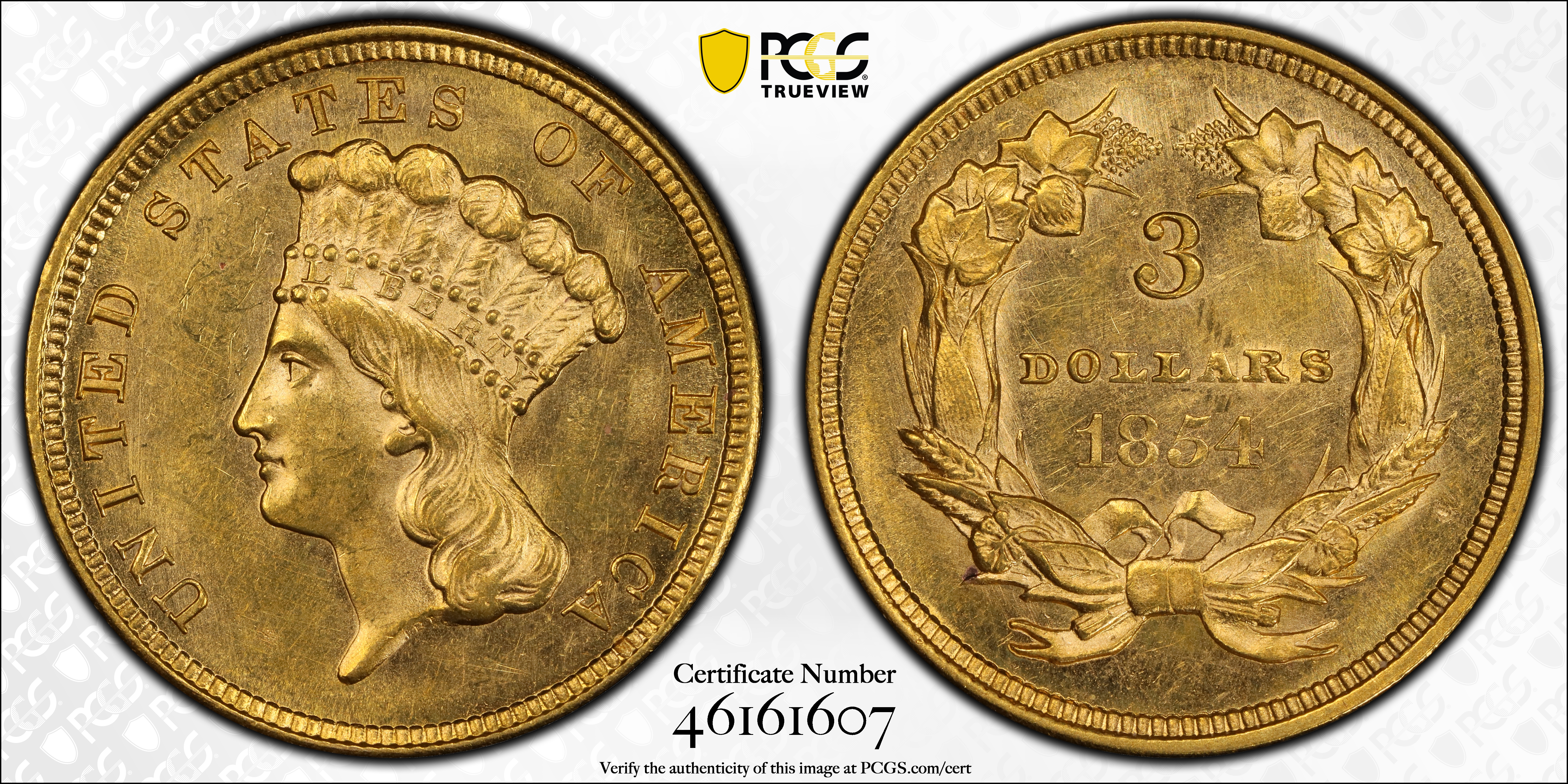 1854 $3 MS63 Certification #46161607, PCGS #7969