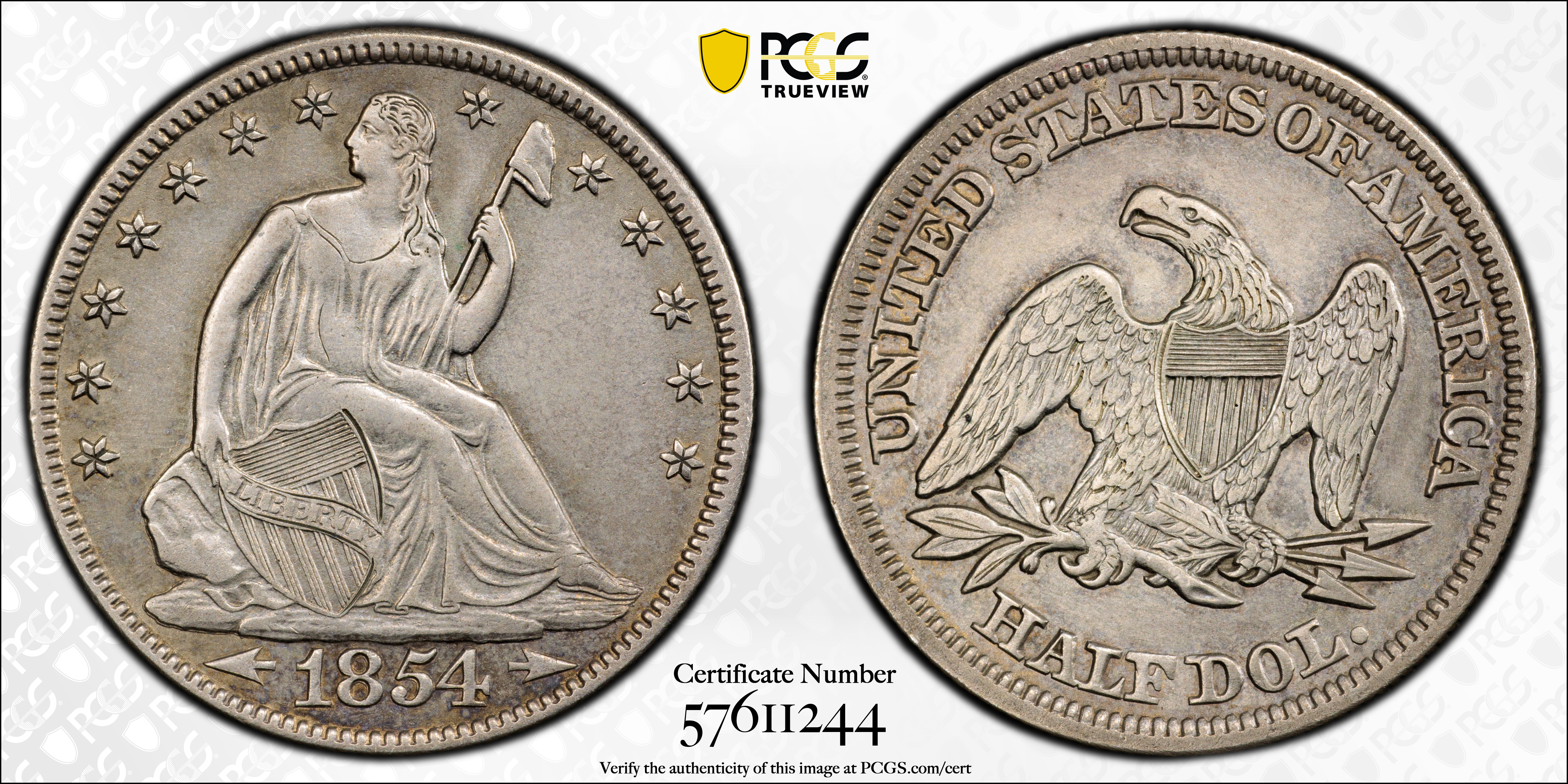In 1854, Half Dollars continued to show arrowheads on either side of the date, but the rays were removed from the reverse. The Philadelphia Mint produced nearly three million Half Dollars; the New Orleans Mint struck over five million Half Dollars; and the San Francisco Mint produced none (this newly opened Mint focused on gold coins in its first year).