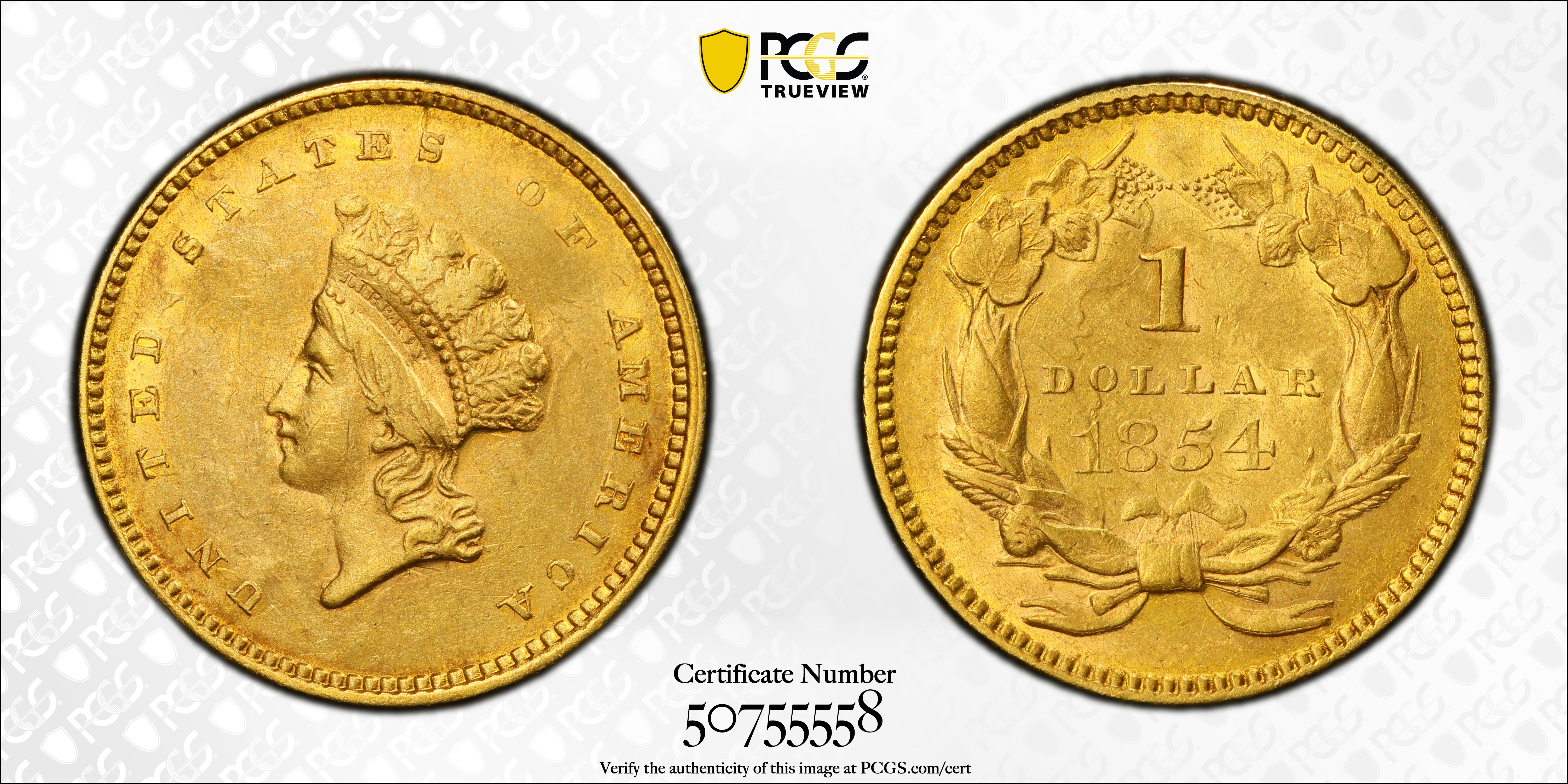 1854 G$1 Type 2 AU55 Certification #50755558, PCGS #7531