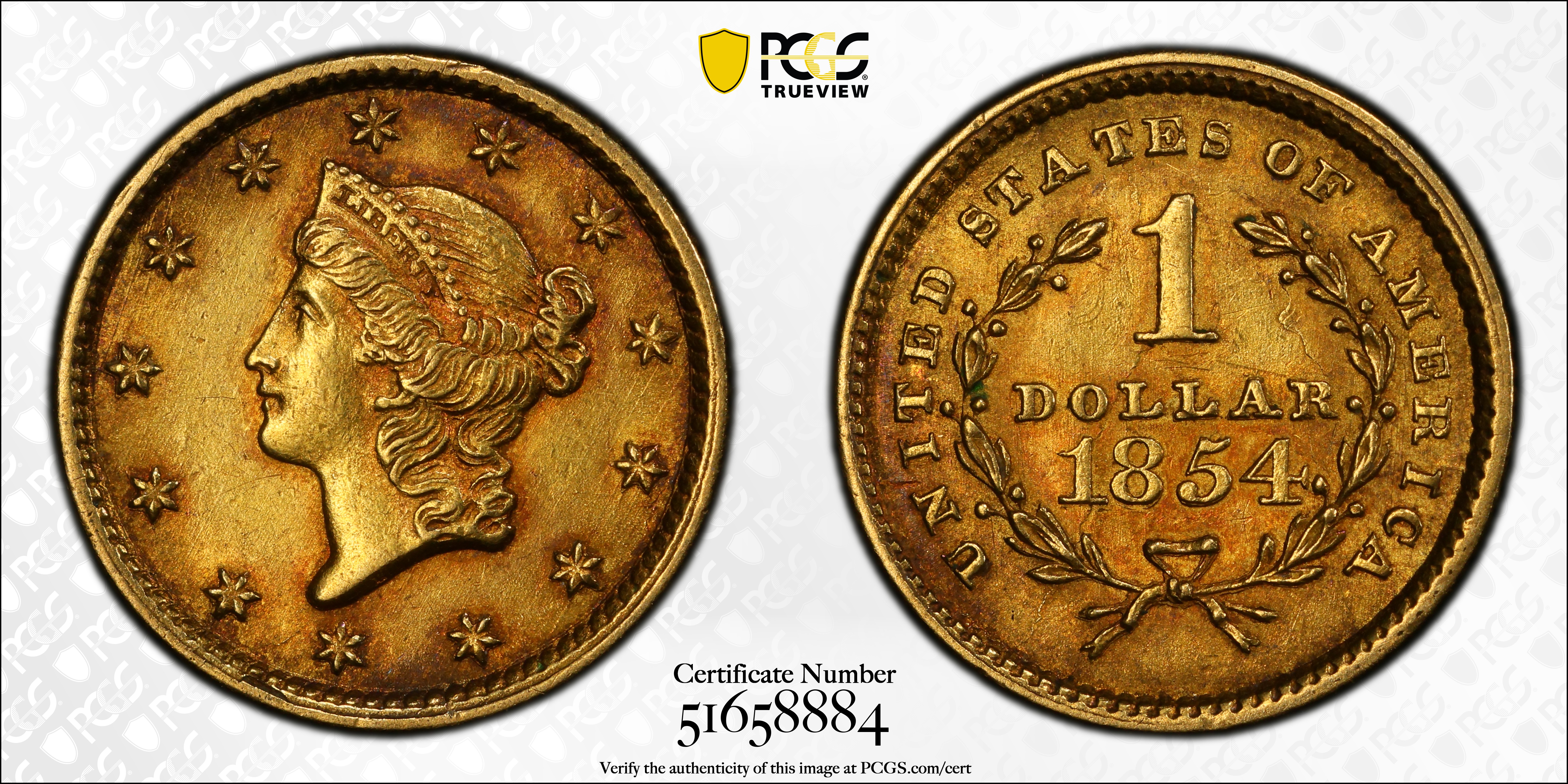 1854 G$1 Type 1 AU58+ Certification #51658884, PCGS #7525
