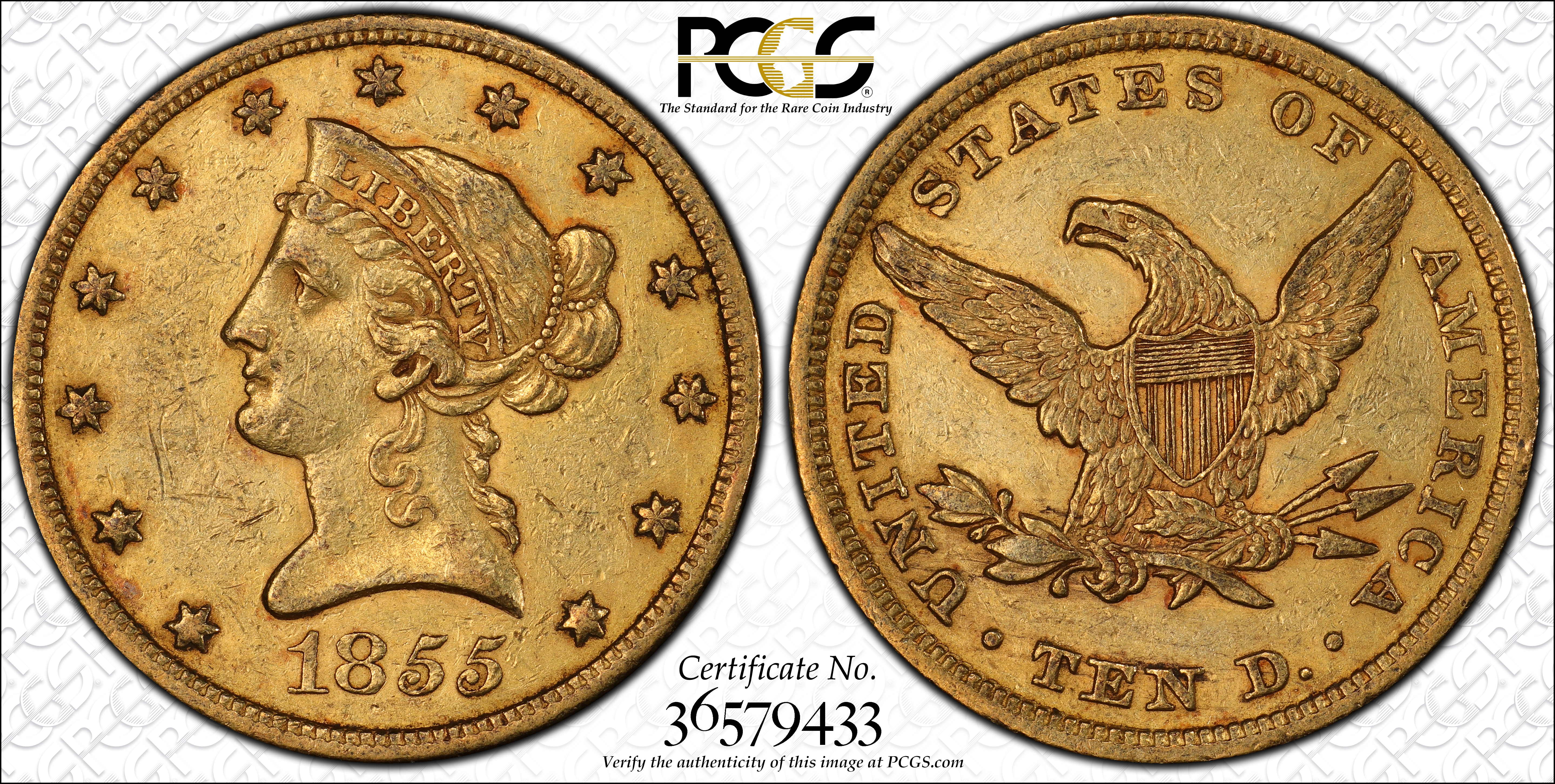 1855 $10 AU53 Certification #36579433, PCGS #8616