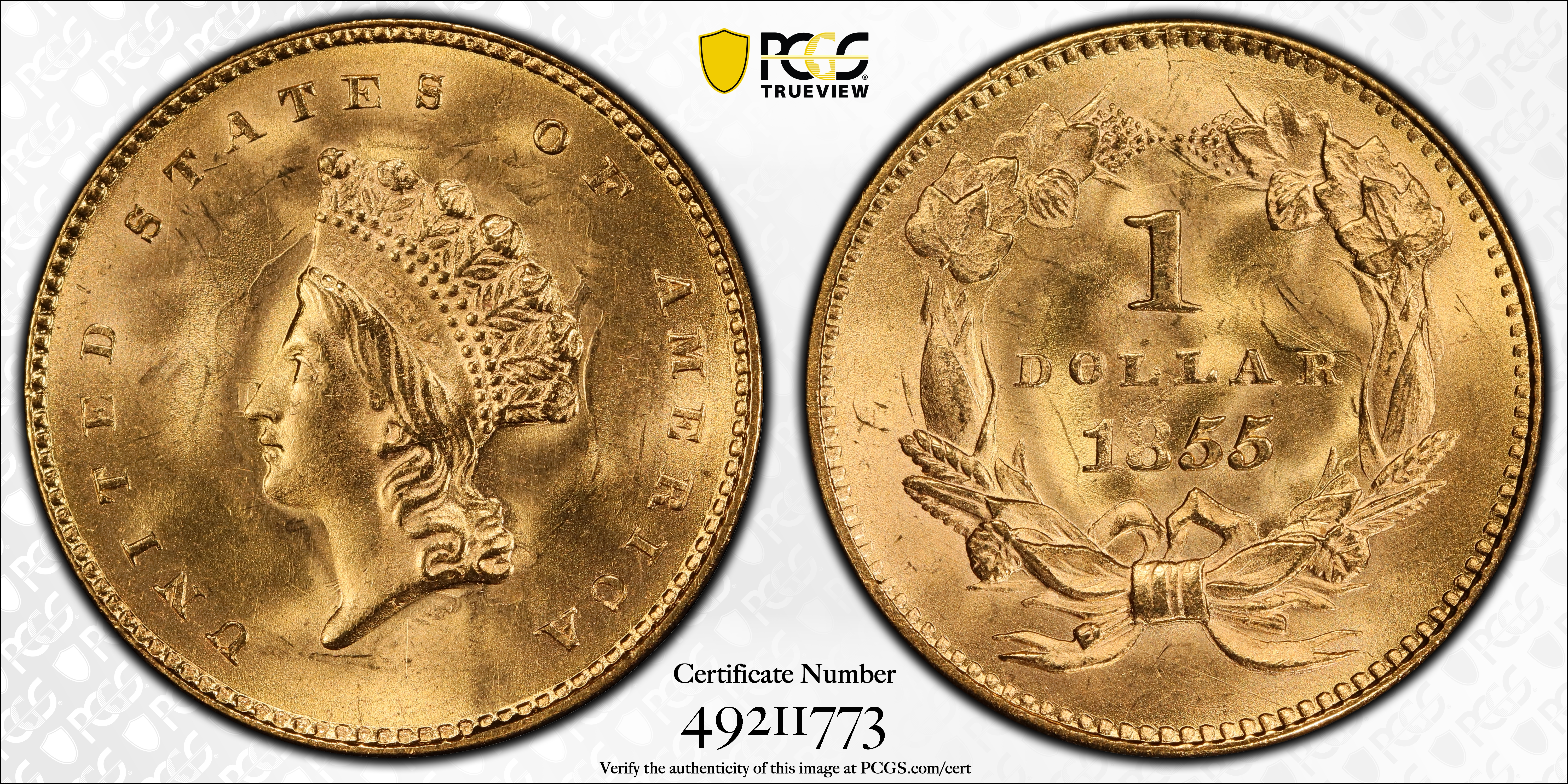 1855 G$1 MS66 Certification #49211773, PCGS #7532