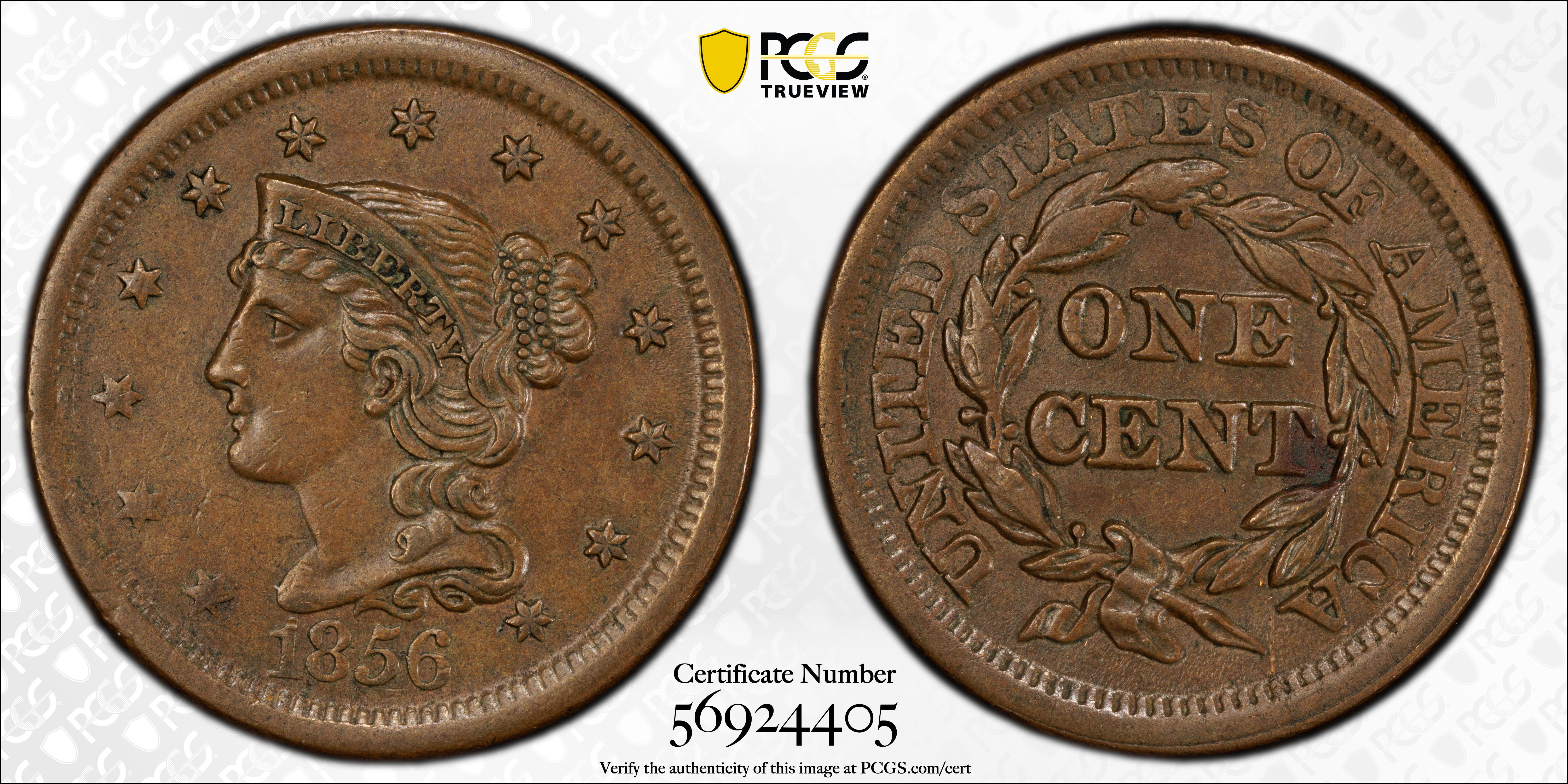 1856 1C Slanted 5, BN AU55BN Certification #56924405, PCGS #1922