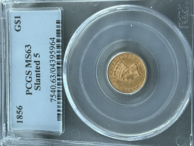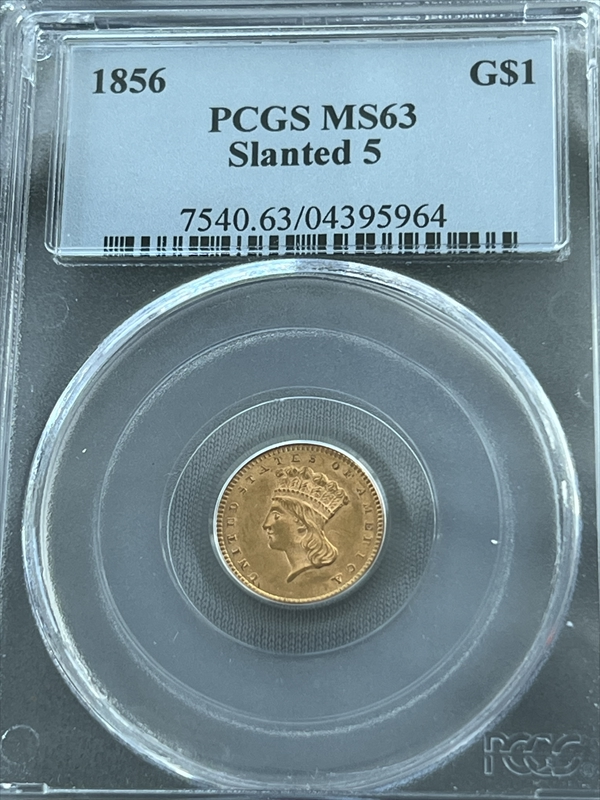 1856 G$1 Slanted 5 MS63 Certification #04395964, PCGS #7540