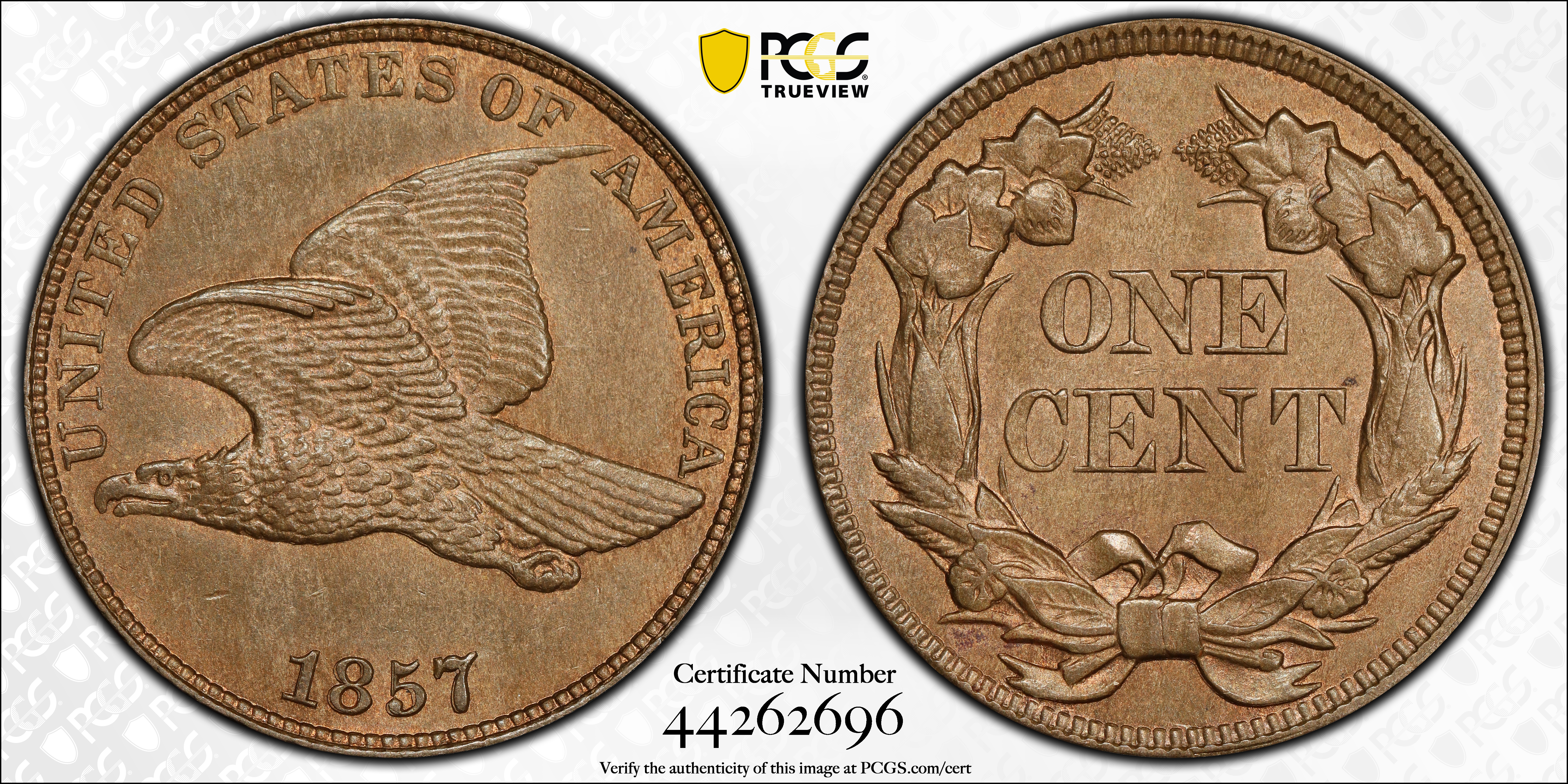 1857 1C Flying Eagle MS64 Certification #44262696, PCGS #2016