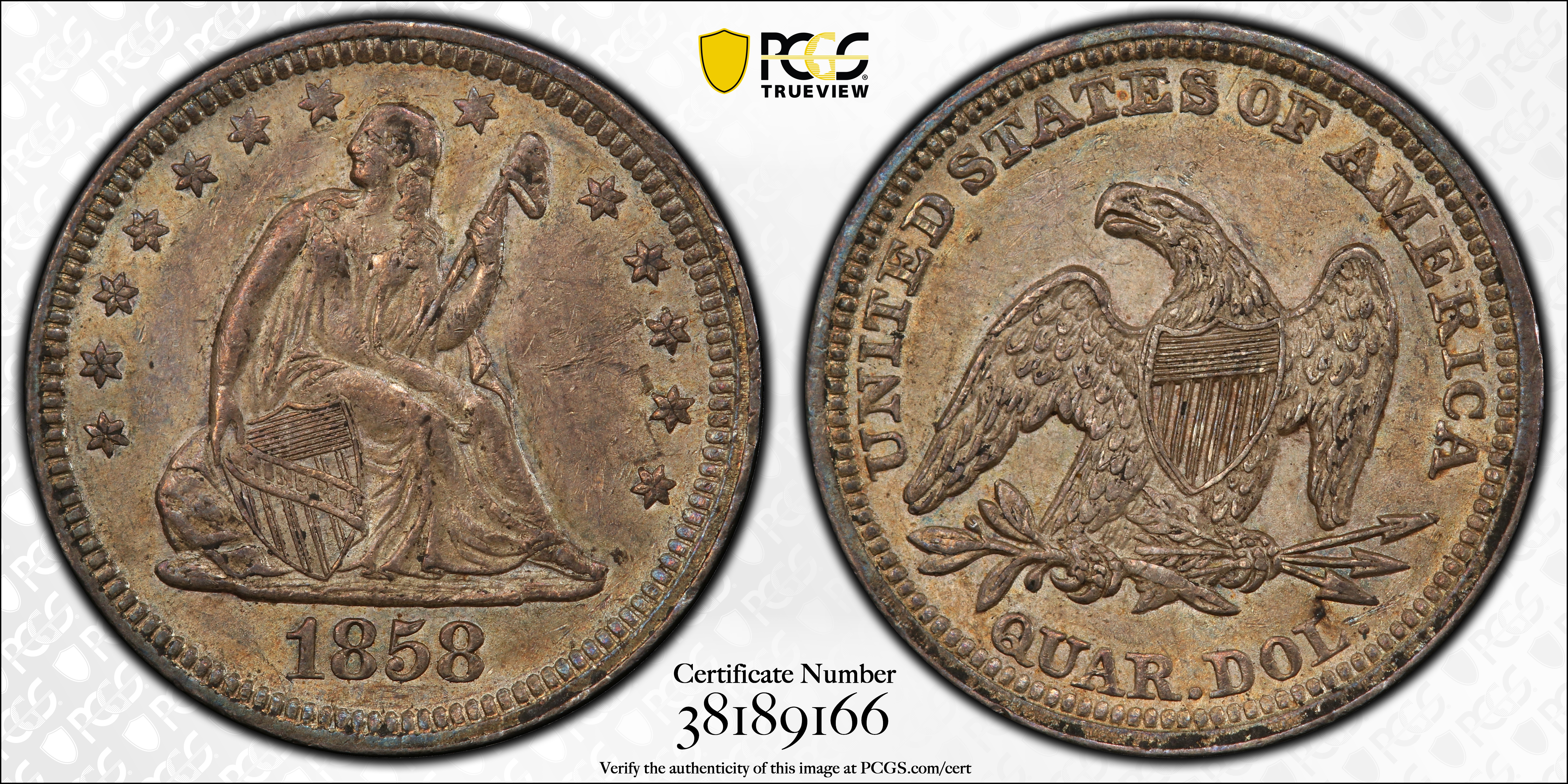 1858 25C AU55 Certification #38189166, PCGS #5445