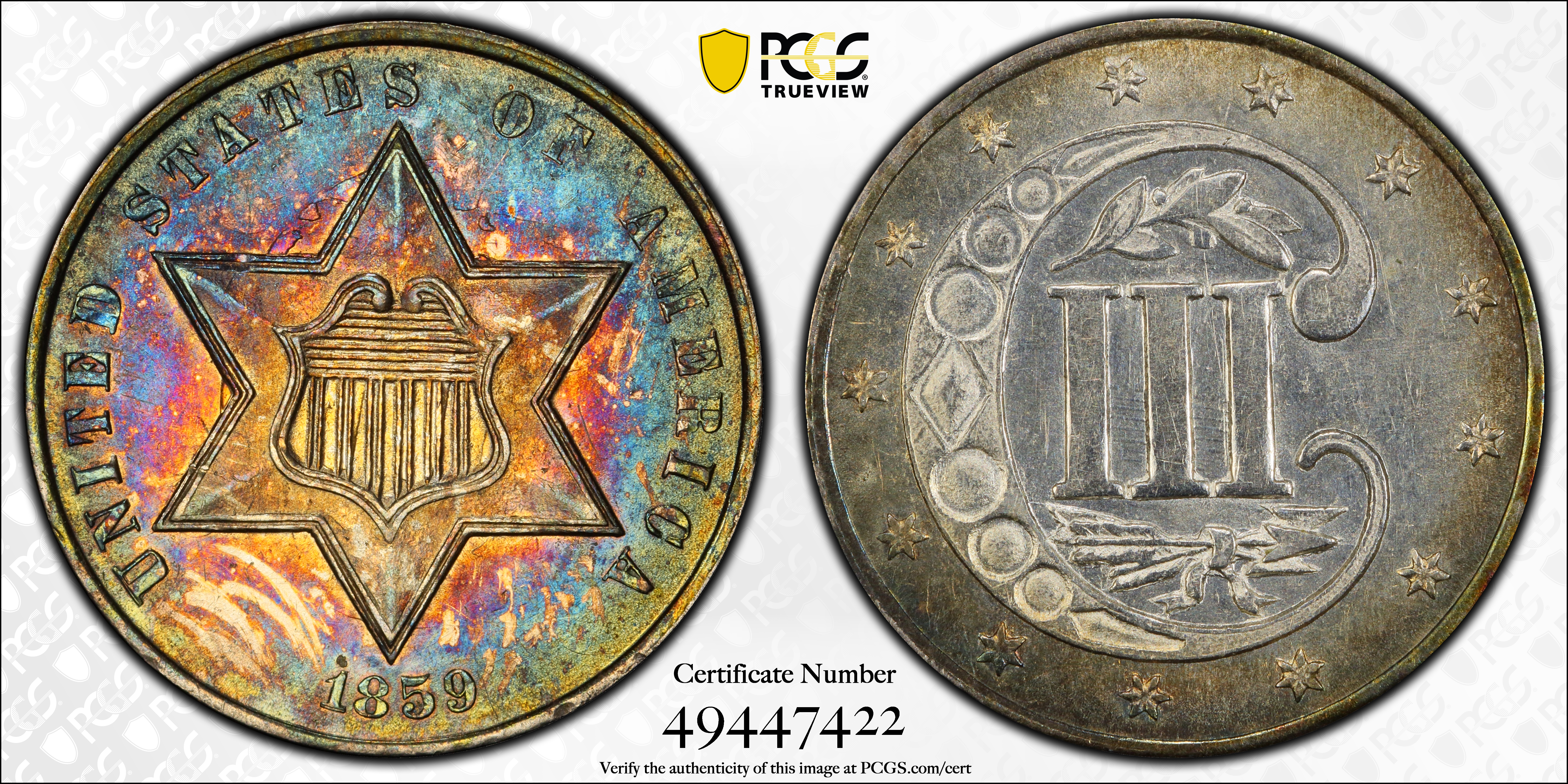 1859 3CS MS62 Certification #49447422, PCGS #3677