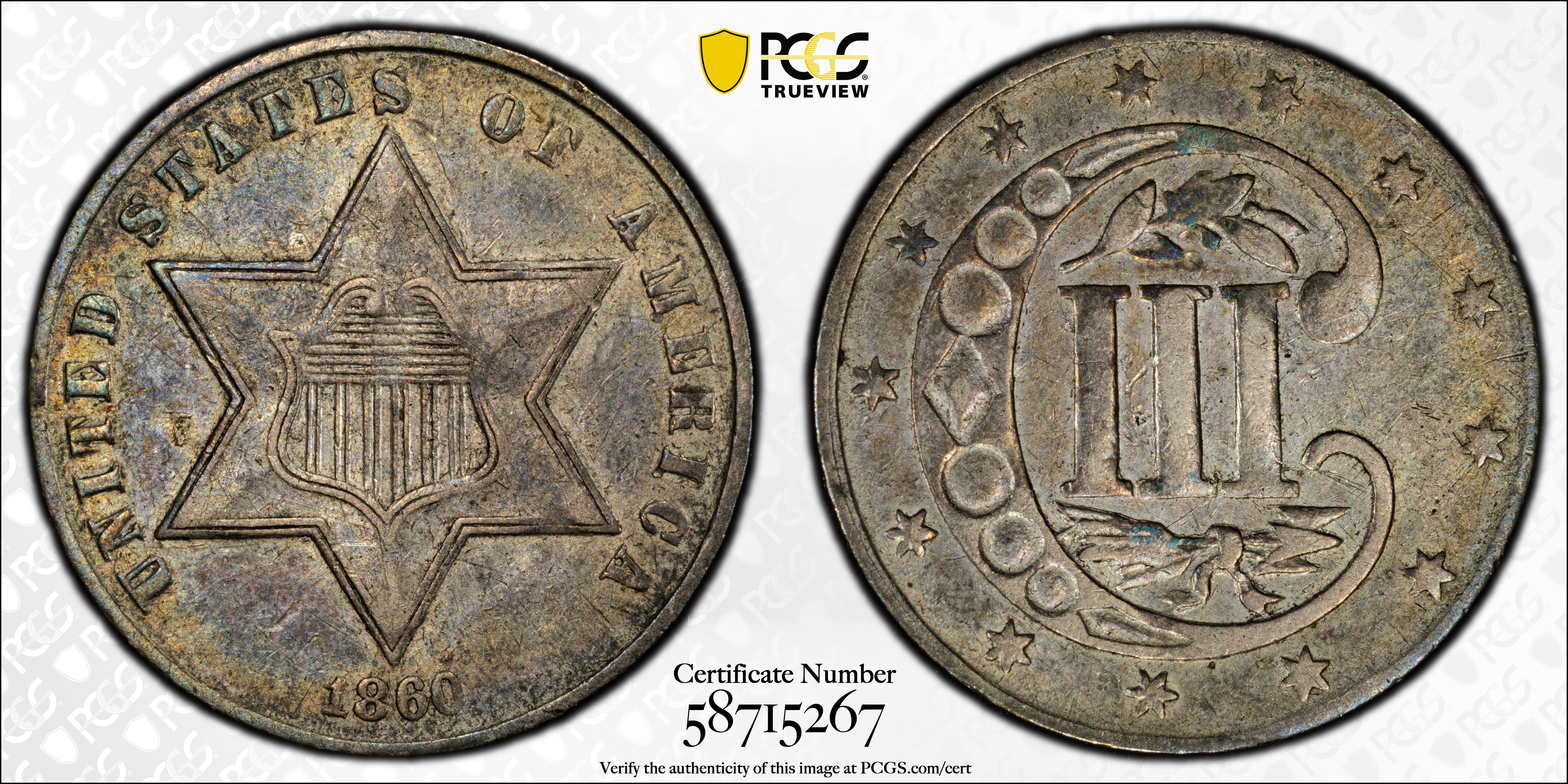 1860 3CS AU50 Certification #58715267, PCGS #3678