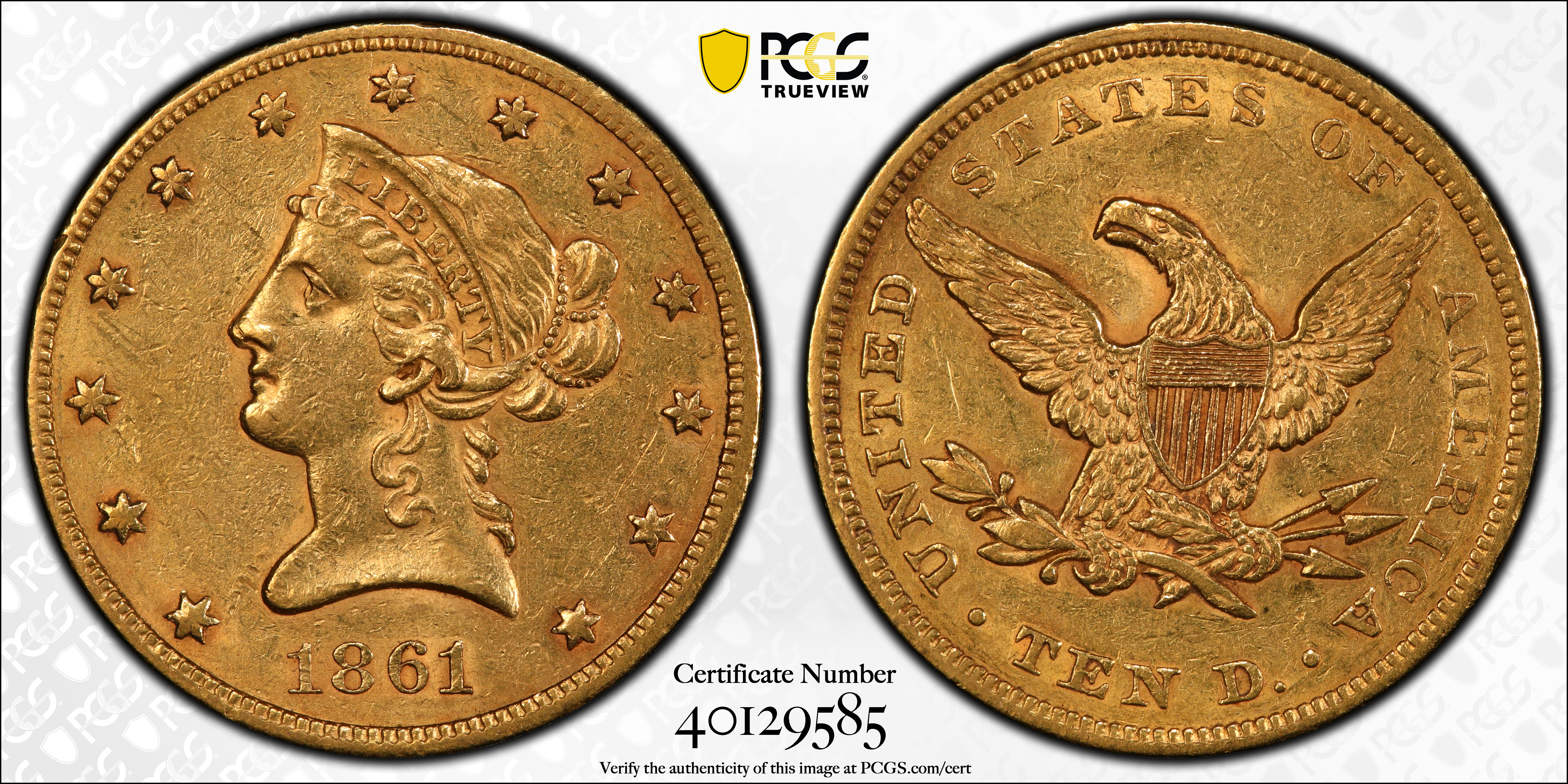 1861 $10 AU50 Certification #40129585, PCGS #8633