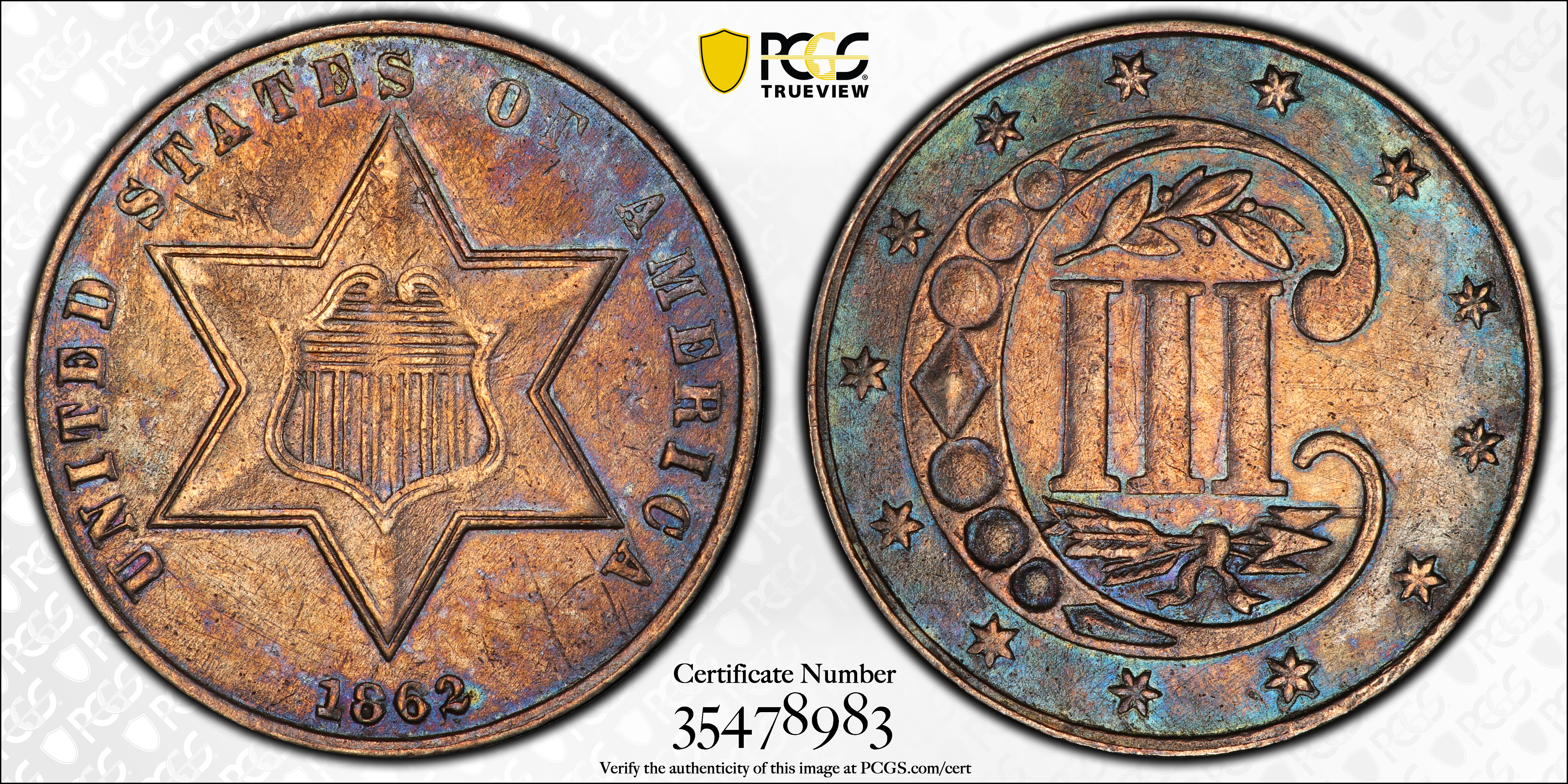 In terms of rarity, the 1862/1 Three-Cent Silver is roughly three times as scarce as the "normal" 1862, but the overdate commands only a small premium except in the highest grades. Because collectors have known about the variety for such a long time, numerous Mint State examples have been discovered. The most frequently seen Mint State grade is, surprisingly, MS-65. The finest 1862/1 Three-Cent Silvers are a dozen MS-67's certified by PCGS as of December 2011. No Proof Overdates have been seen.